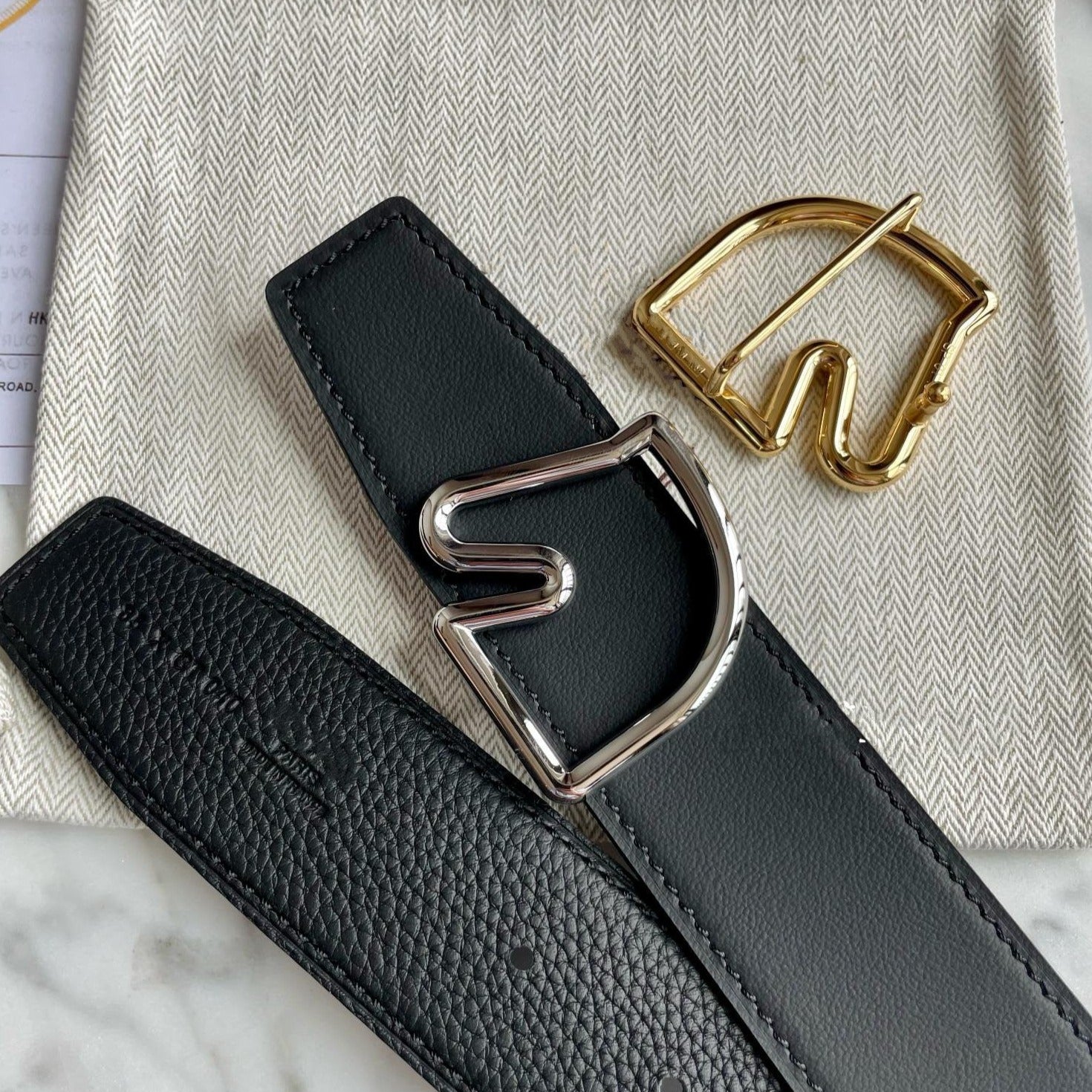 • H Buckle in permabrass plated metal.
