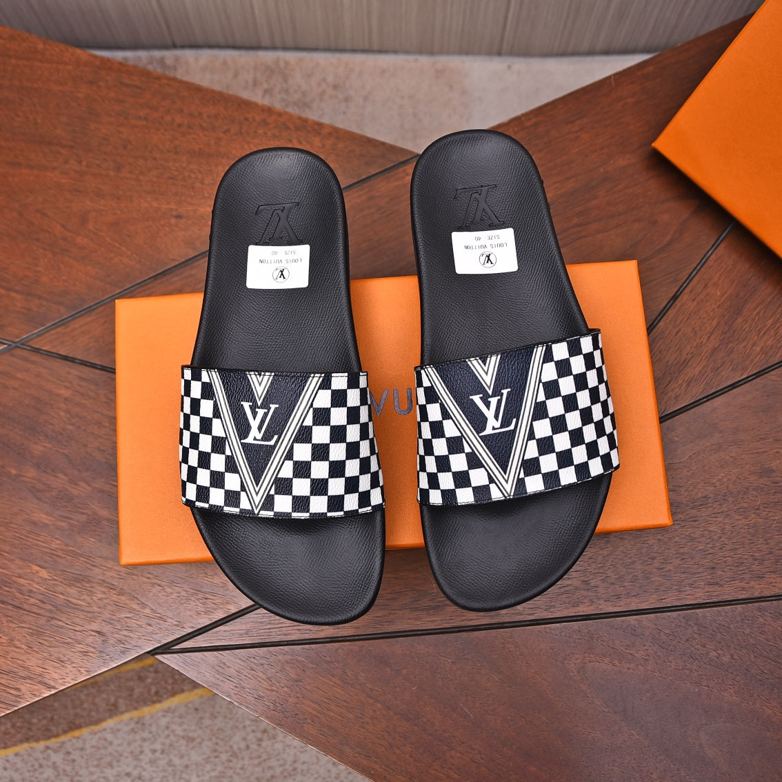 LV SLIPPERS IN BLACK MIX WHITE DAMIER CALFSKIN