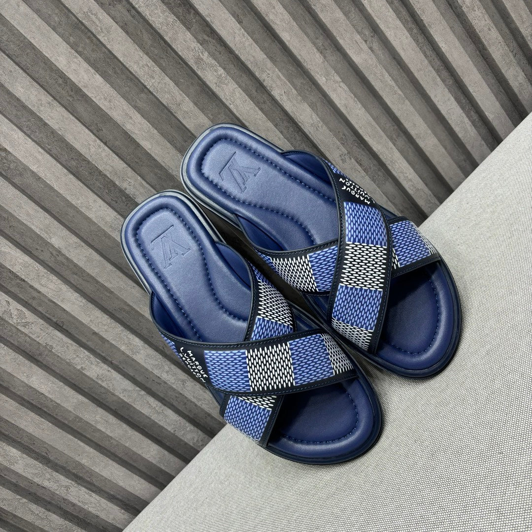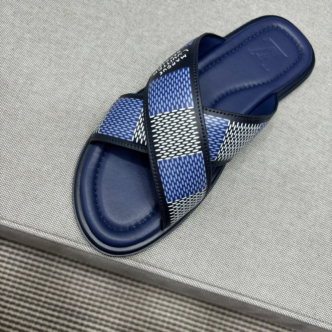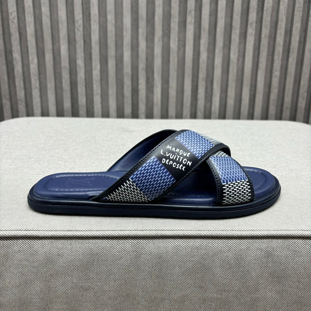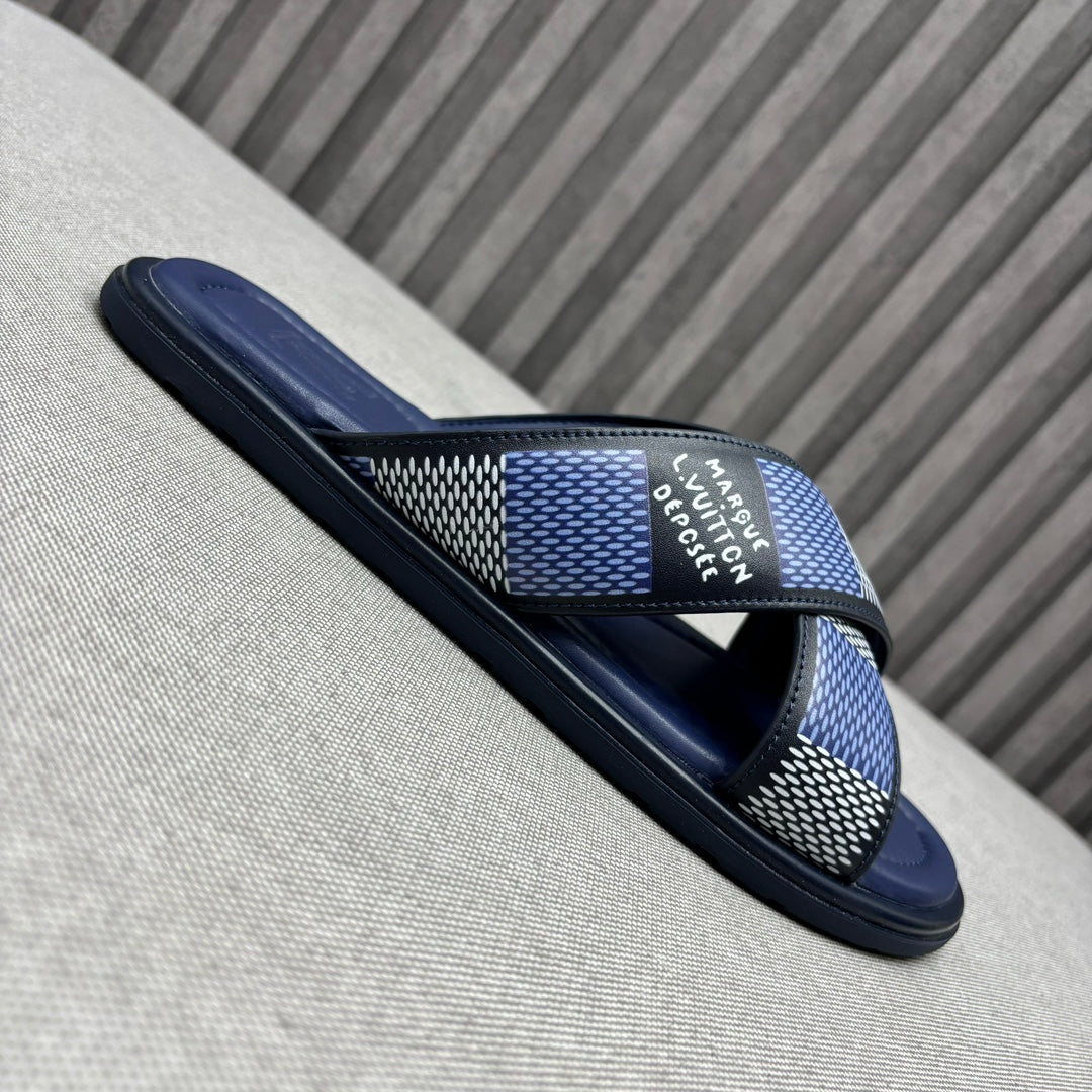 • Premium LV men's slippers, synchronizing with the 2024 early autumn runway collection. The slippers feature a high-quality fabric upper and an original, exclusive comfort sole, ensuring exceptional comfort. These are original factory-followed products.