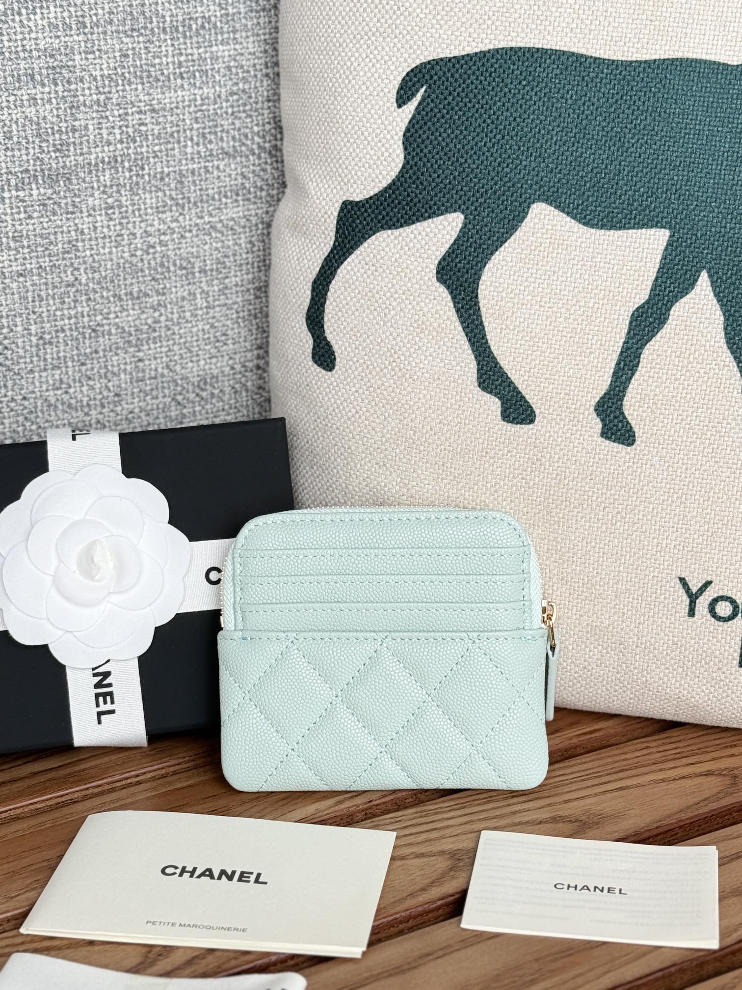 CC Zip Card Holder Wallet Light Blue Gold Metal Caviar 240605