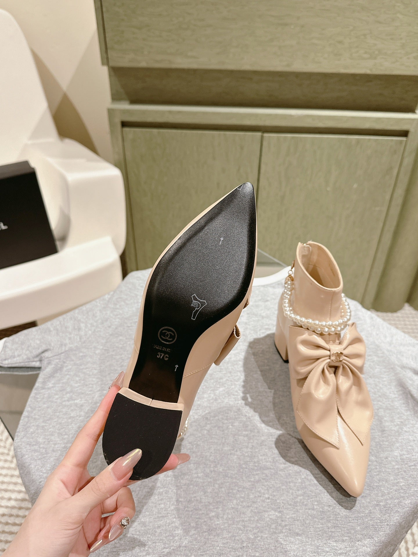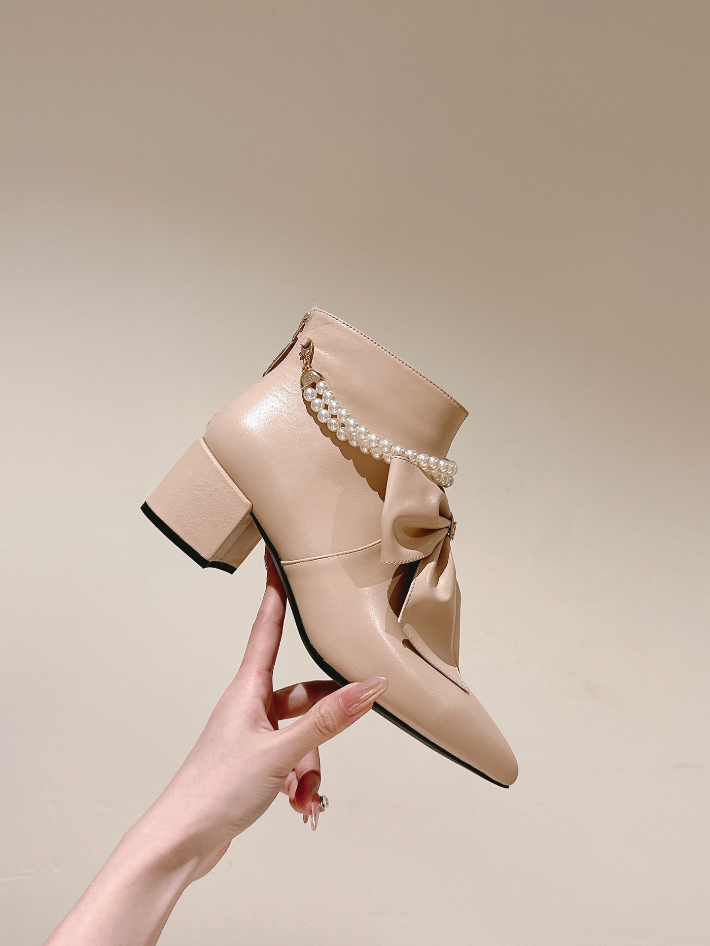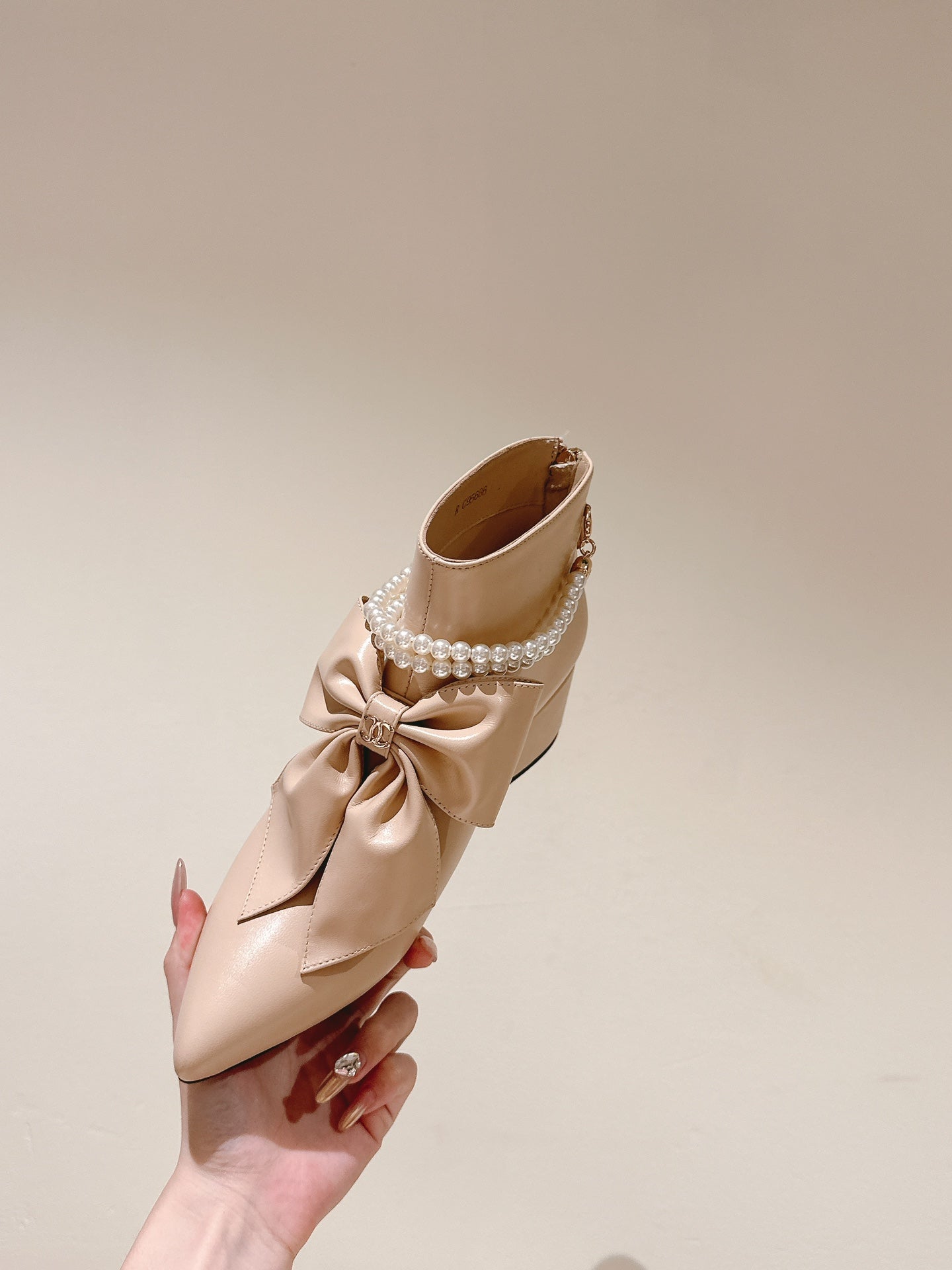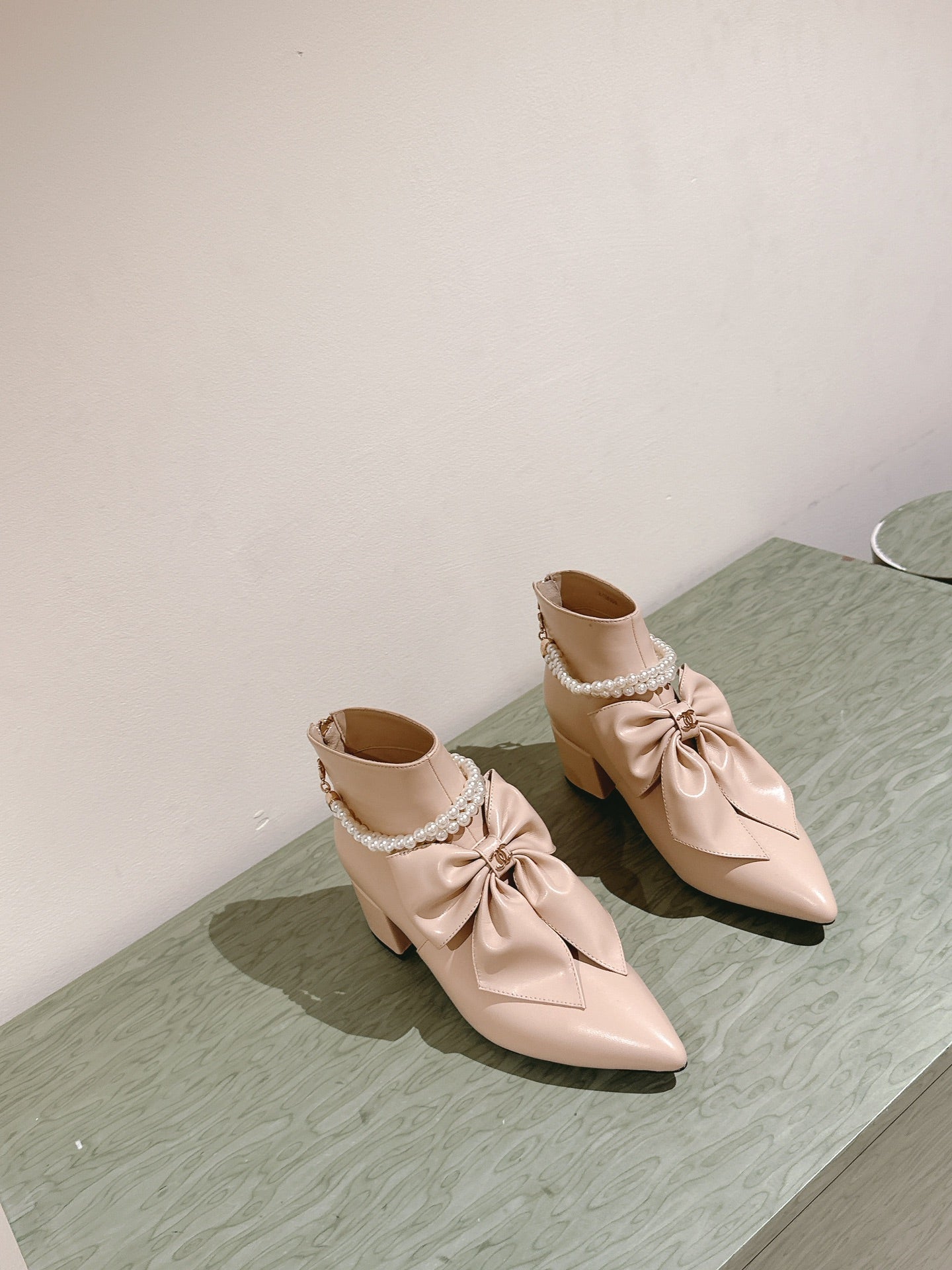 CC 24A Pearl Bow Ankle Boots 65mm Beige Sheepskin 447469