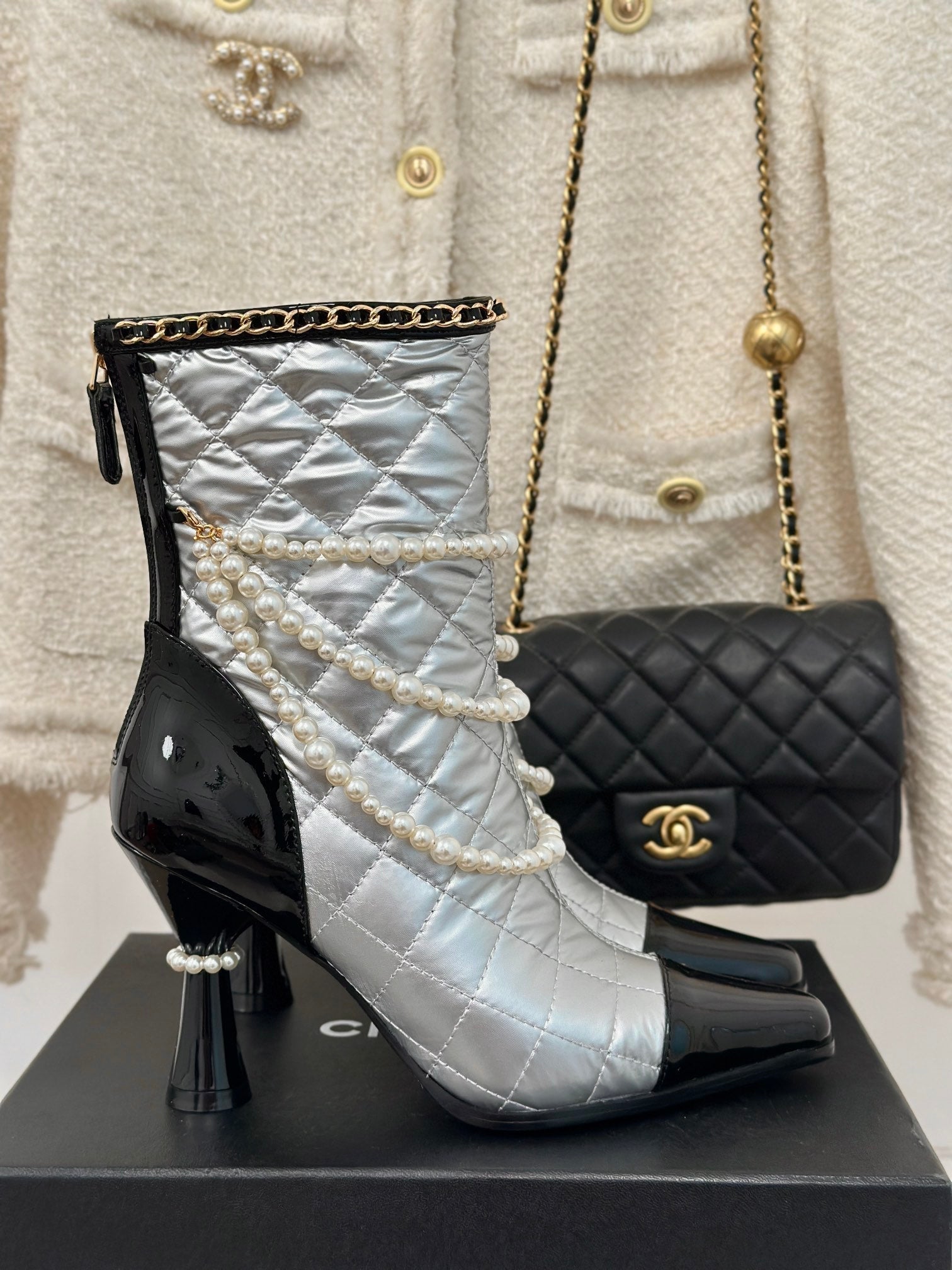 CC Short Boots 80mm Silver Wrinkled Quilted Calfskin