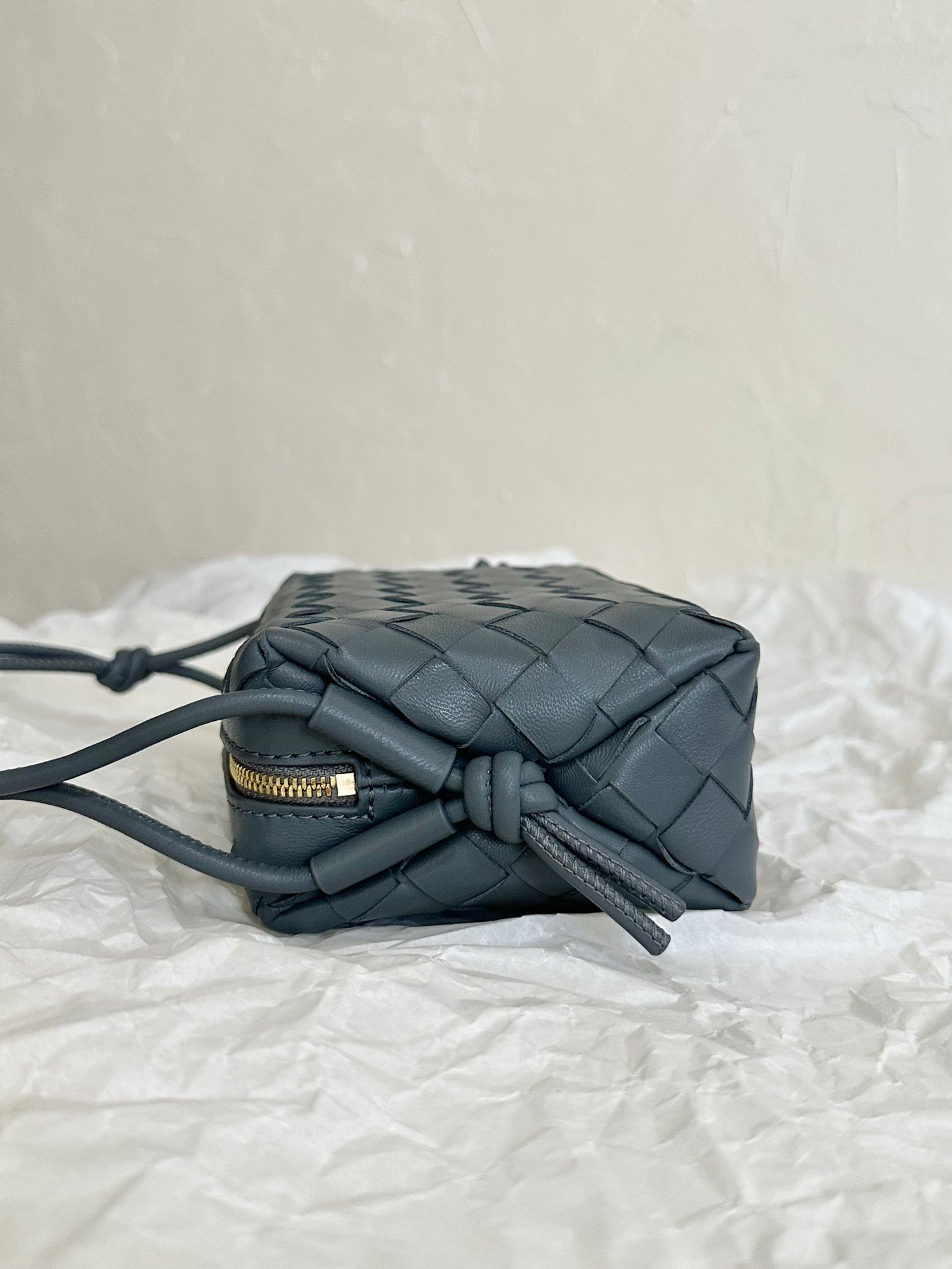 • Mini intrecciato leather crossbody bag with knotted metallic embellishment