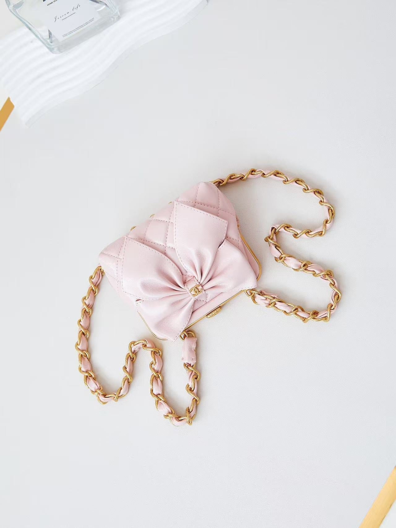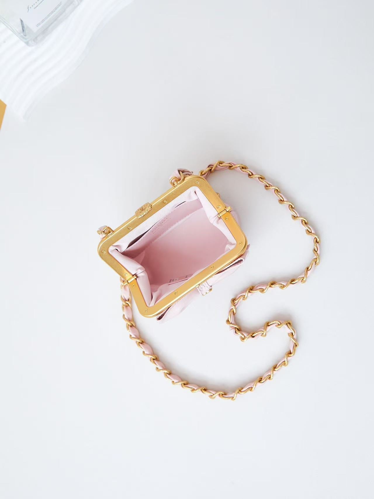 CC 24A Bowknot Kiss Lock Clutch Bag with Chain 13cm Pink Lambskin
