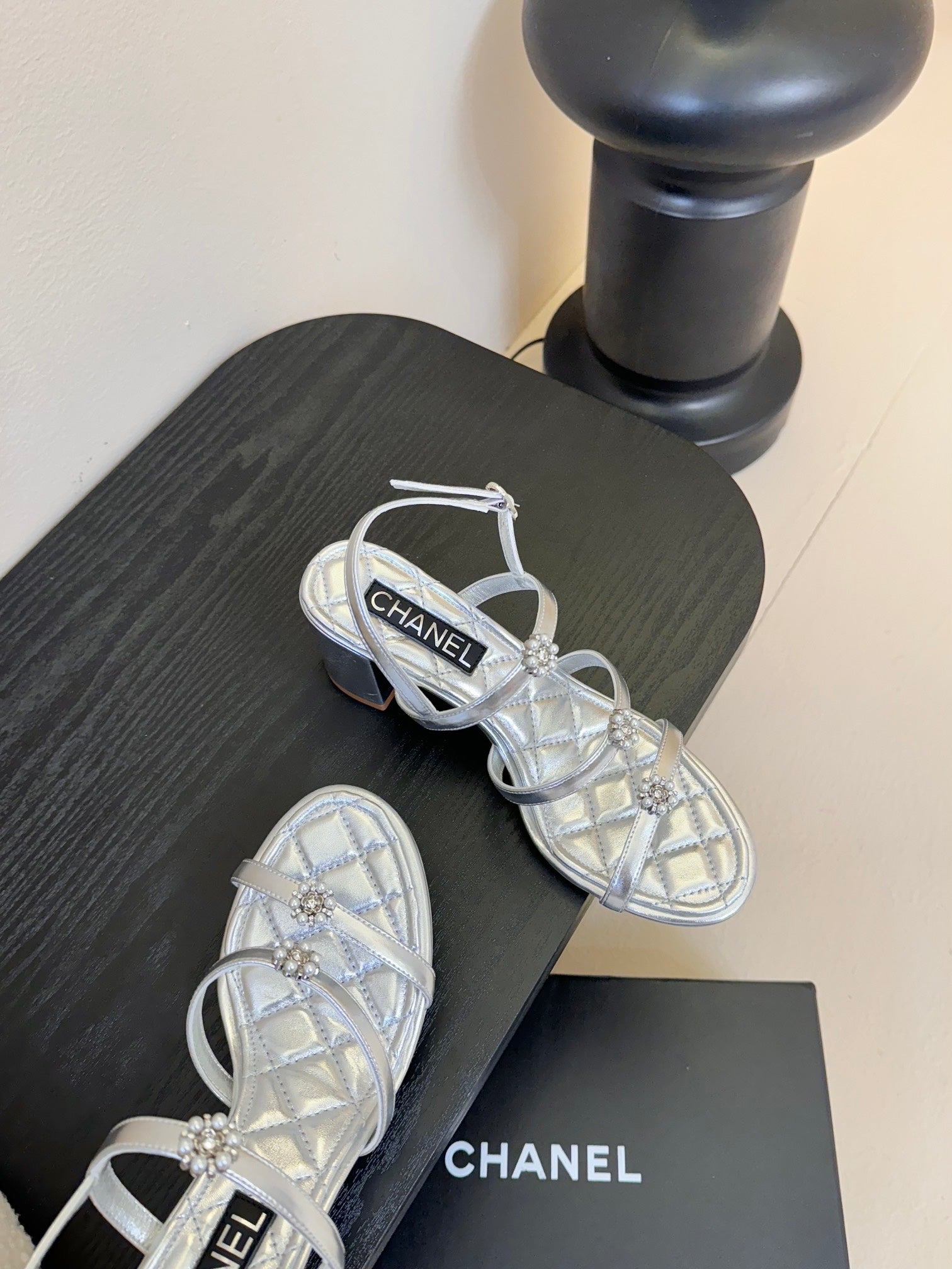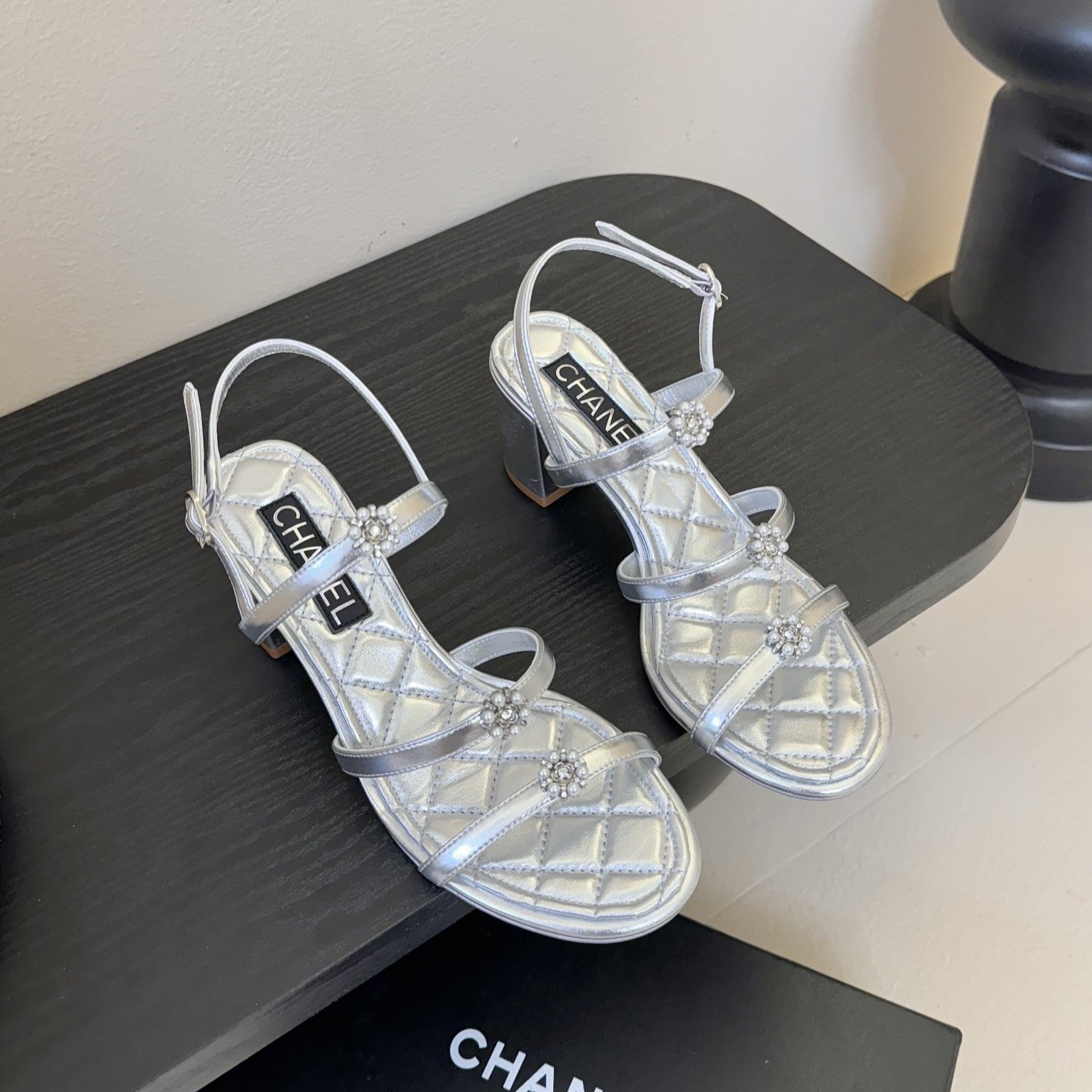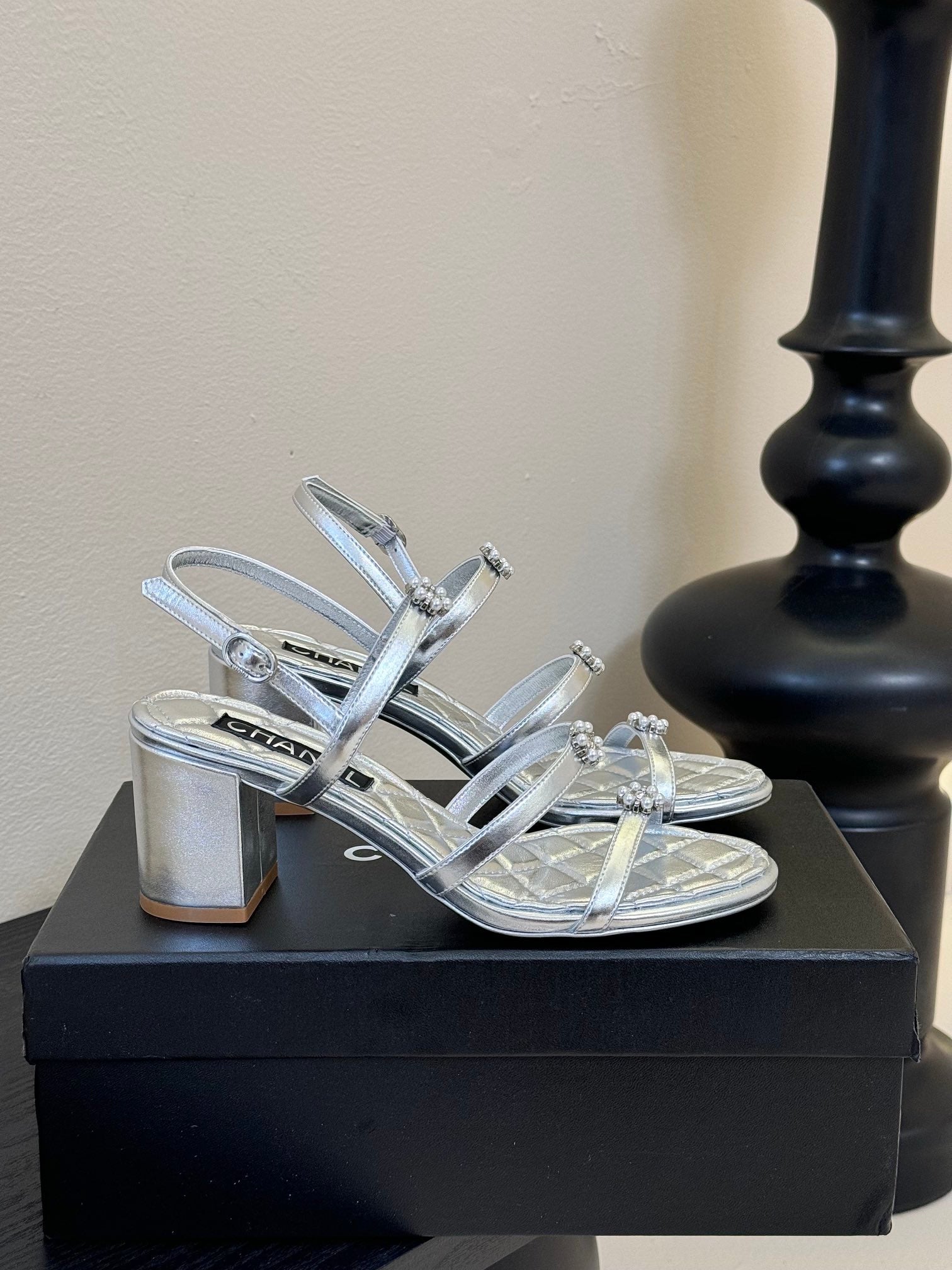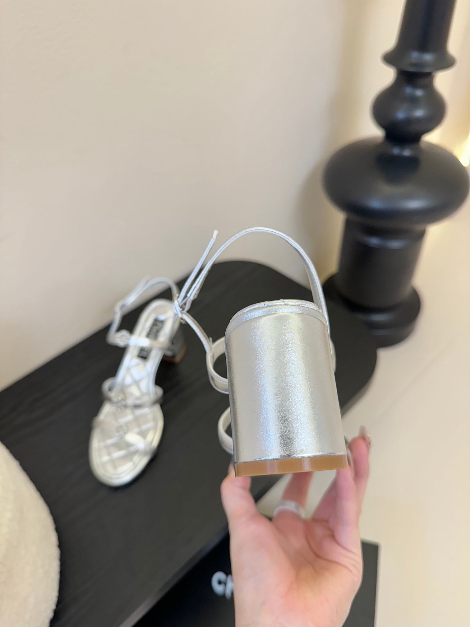 CC 25SS 3 Flowers Heel Sandals 60mm Silver Metallic Sheepskin 351432