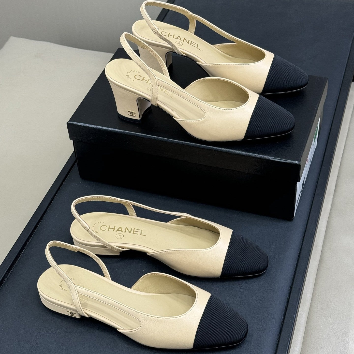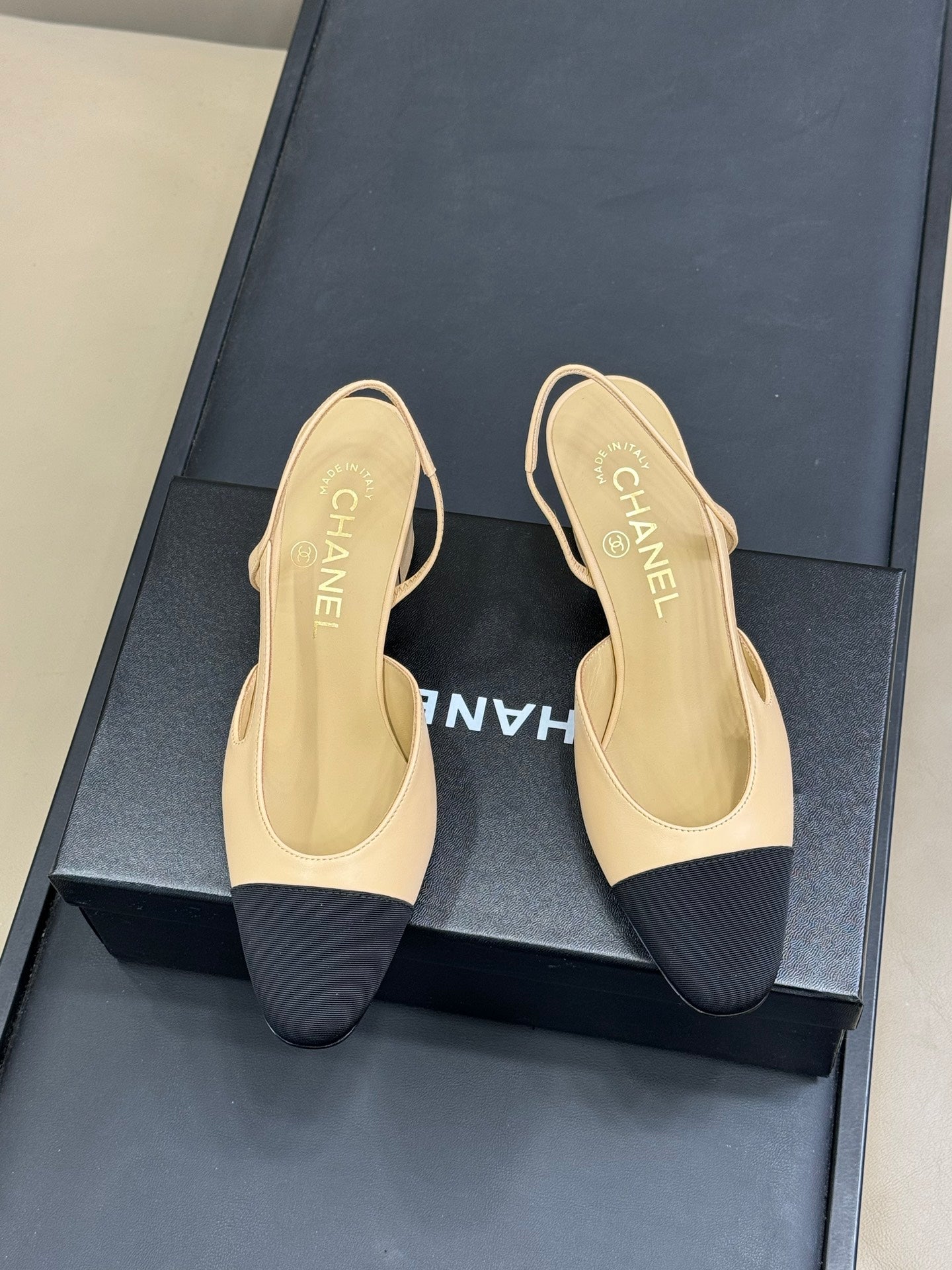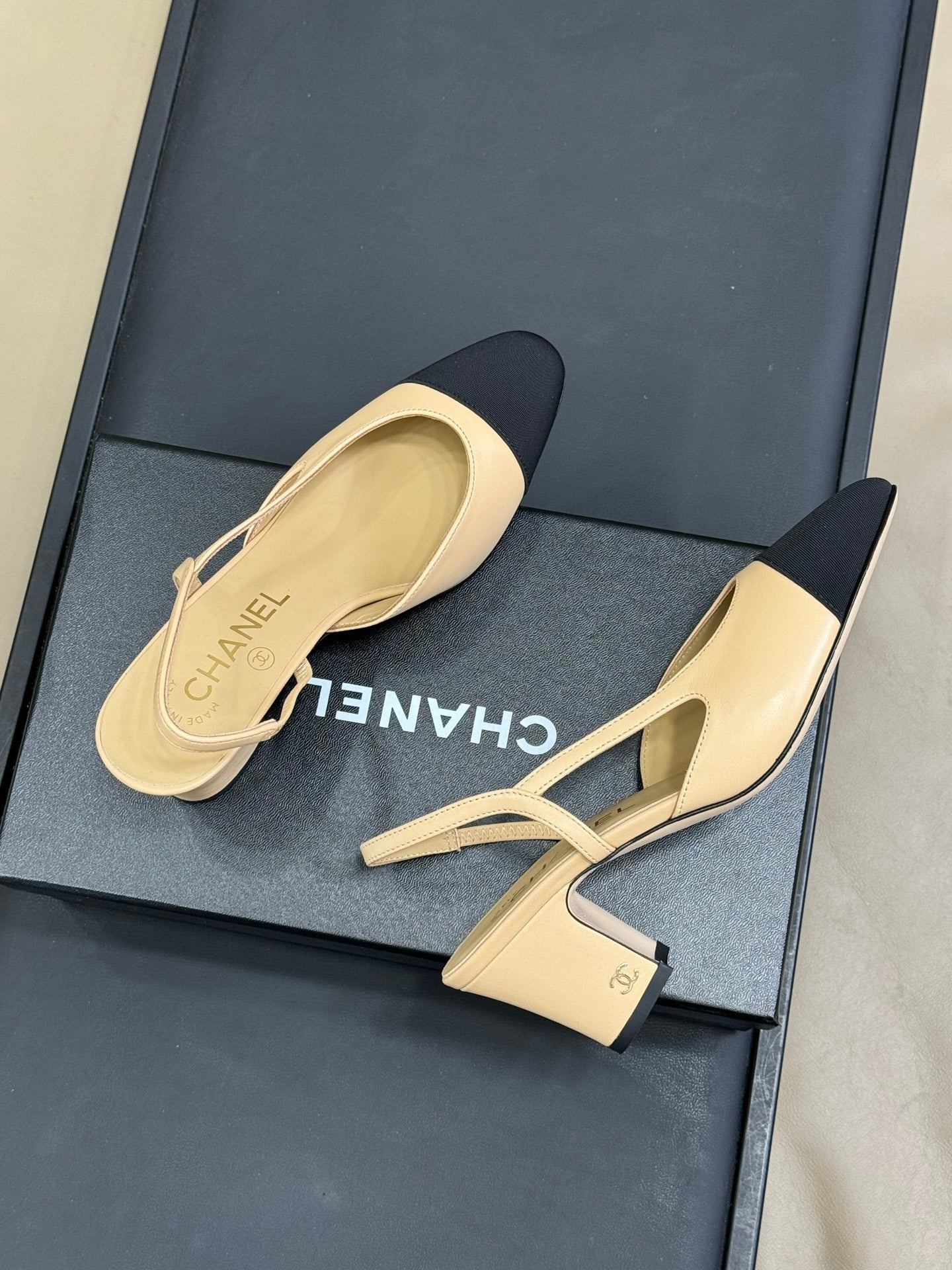 CC Classic Slingback Beige Goatskin Black Grosgrain 282281