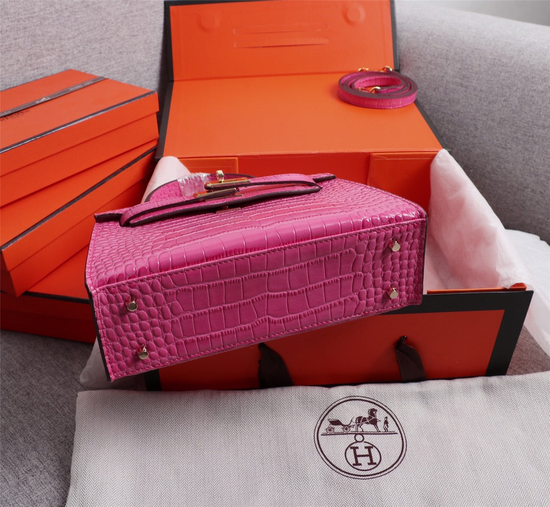 HM KELLY MINI 22 DEEP PINK CROCODILE EMBOSSED CALFSKIN GOLD HARDWARE