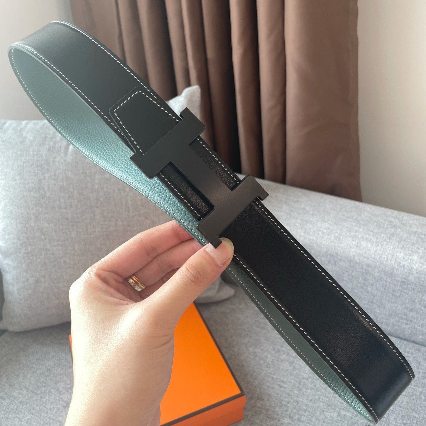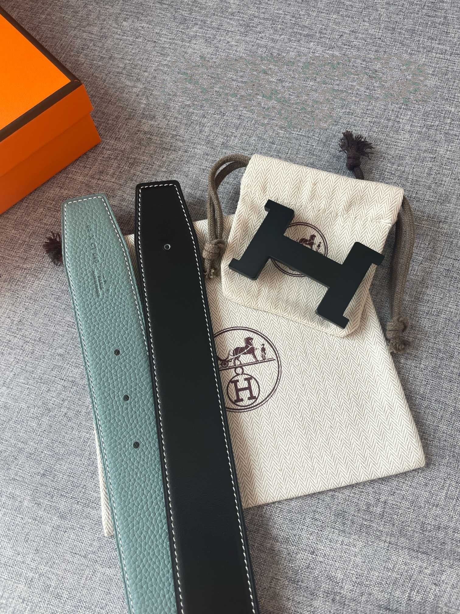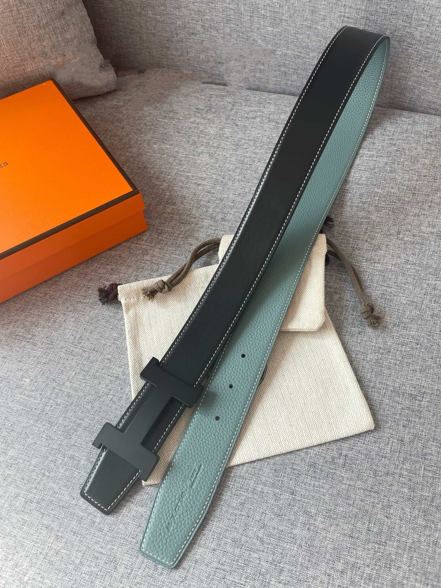 H CONSTANCE REVERSIBLE BELT 38MM BLACK BUCKLE BLACK SKY BLUE LEATHER