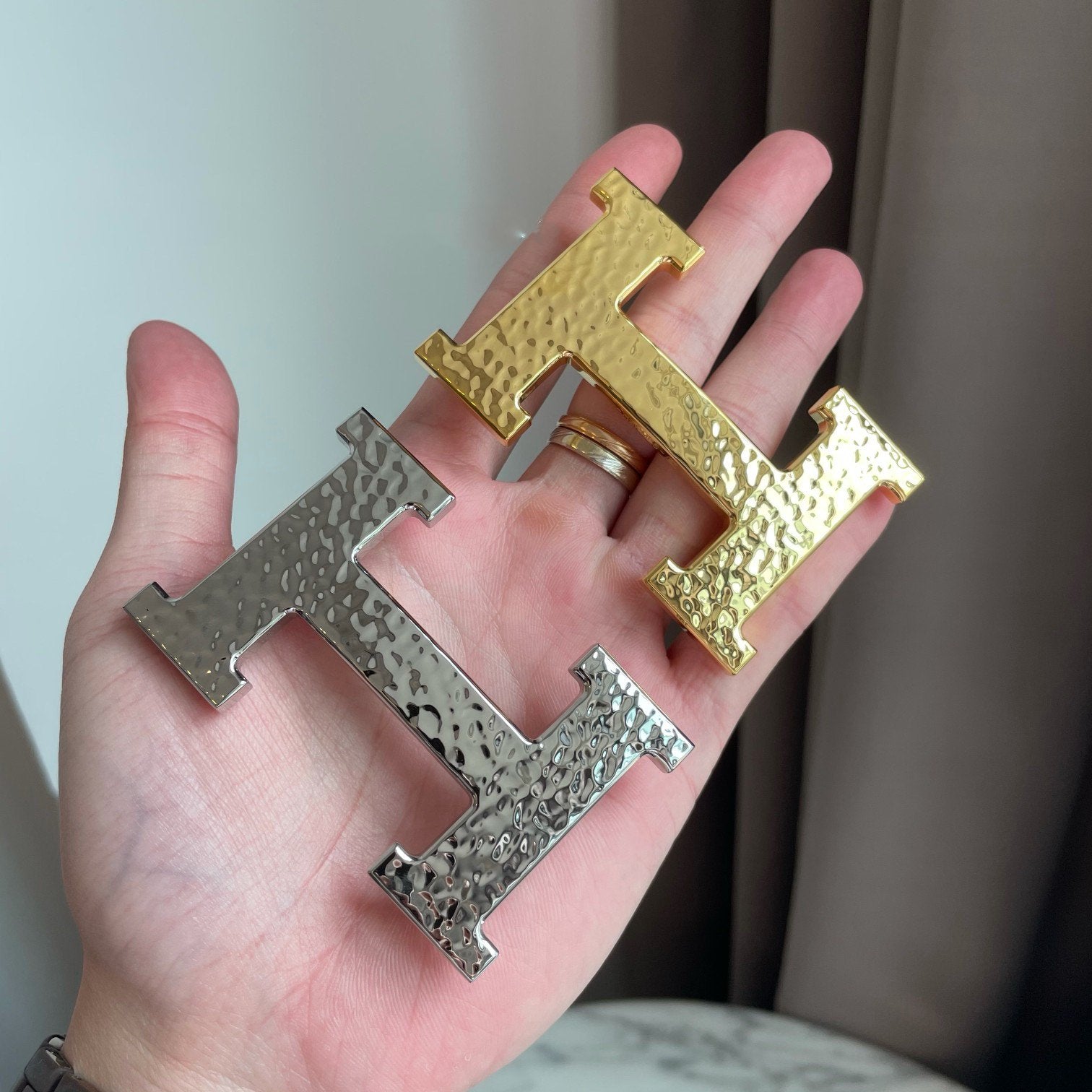 • H Buckle in permabrass plated metal.