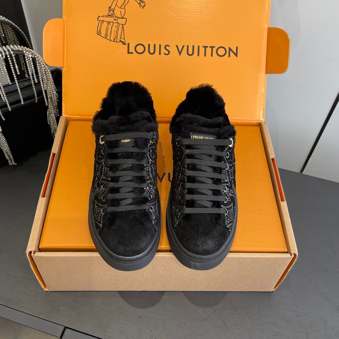 LV Time Out Sneaker 40mm Black Monogram Denim Suede Fleece Lined 533474