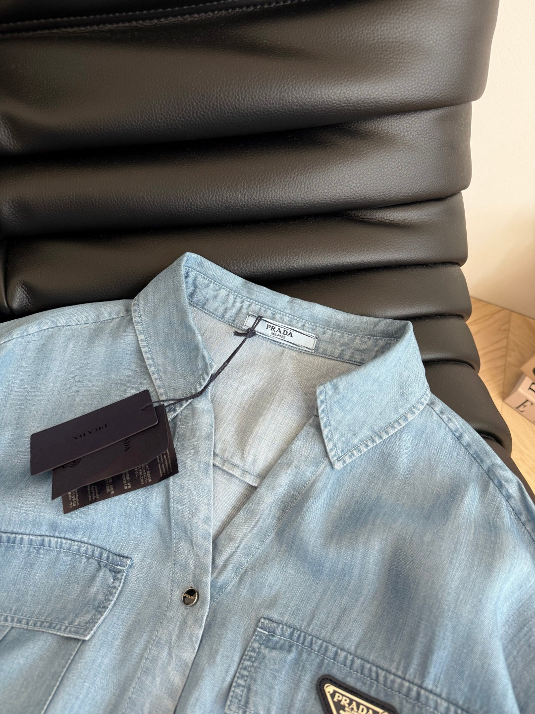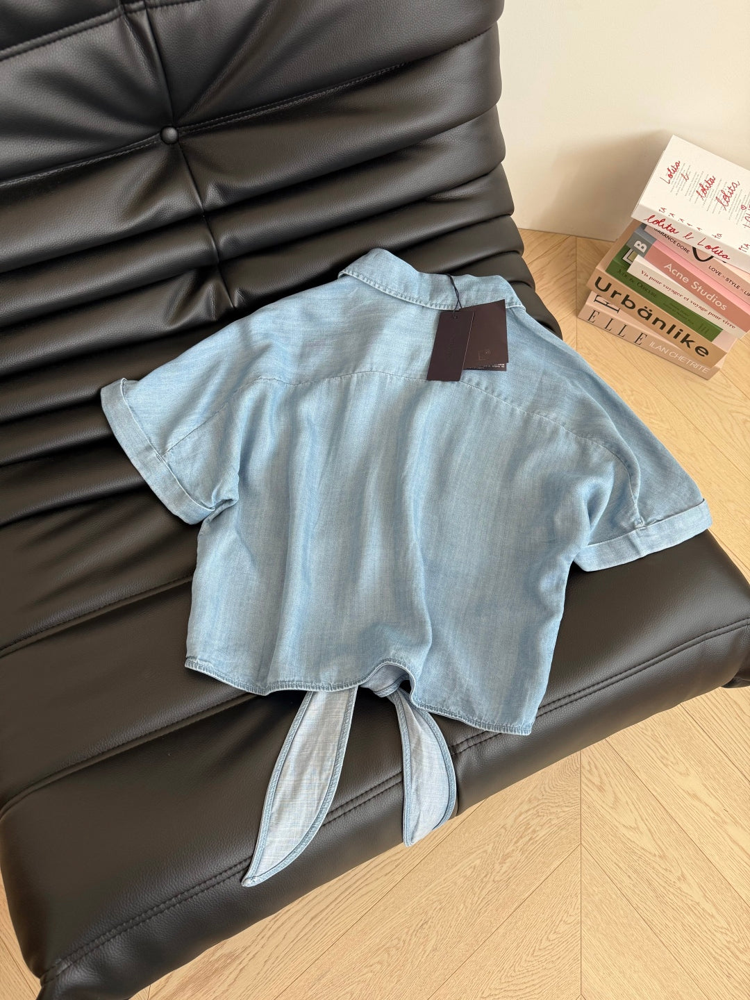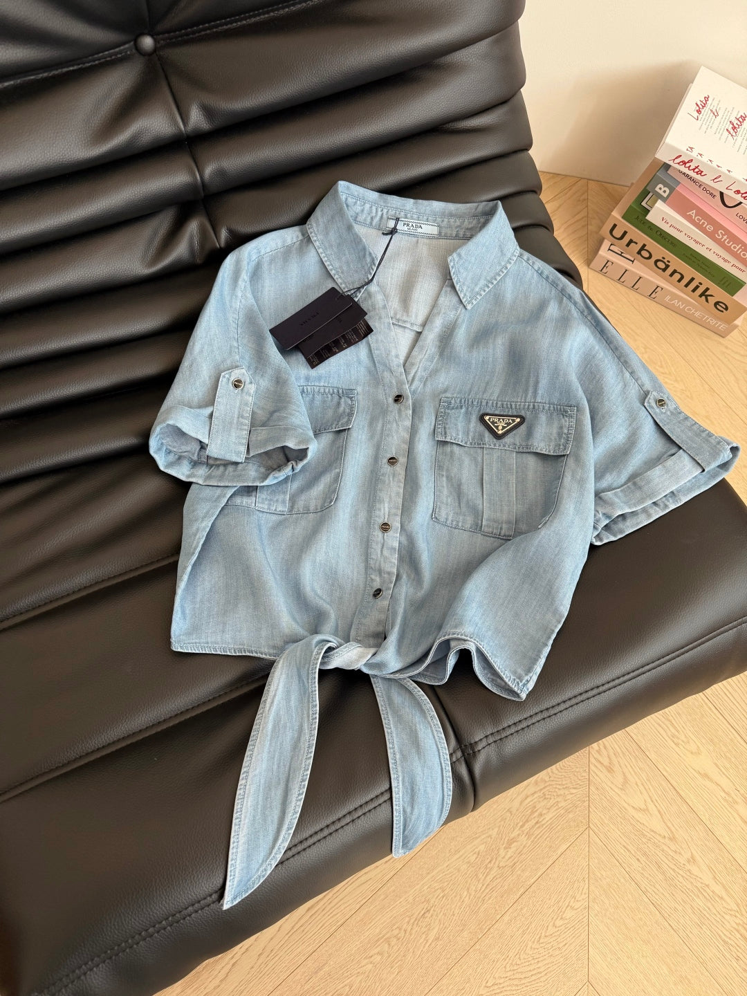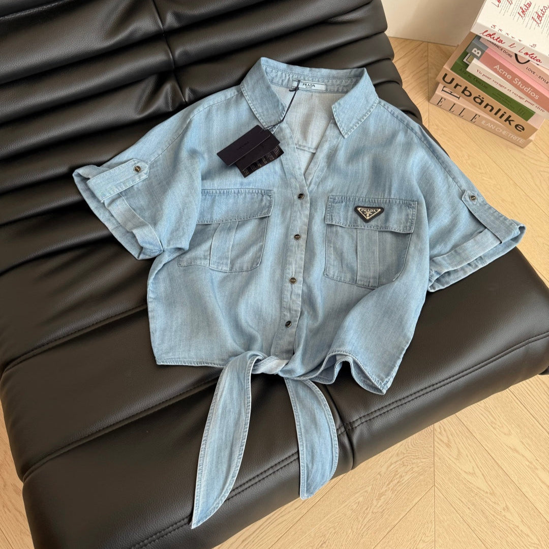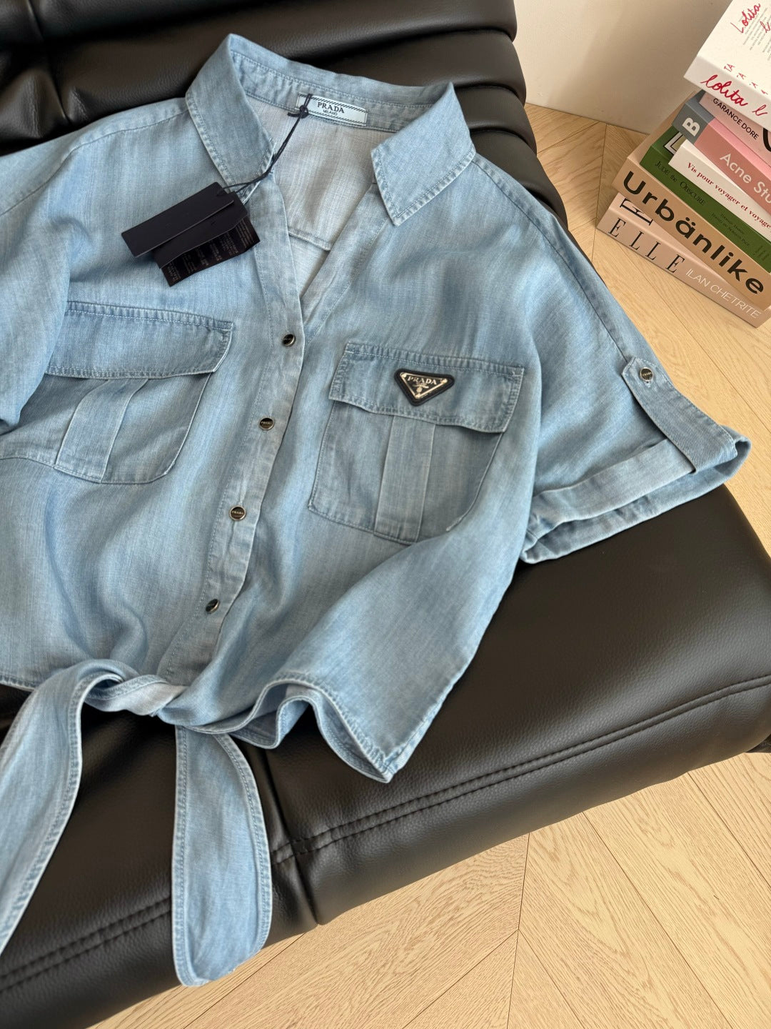 Prada Denim Bow Tie Shirt Light Blue Cotton