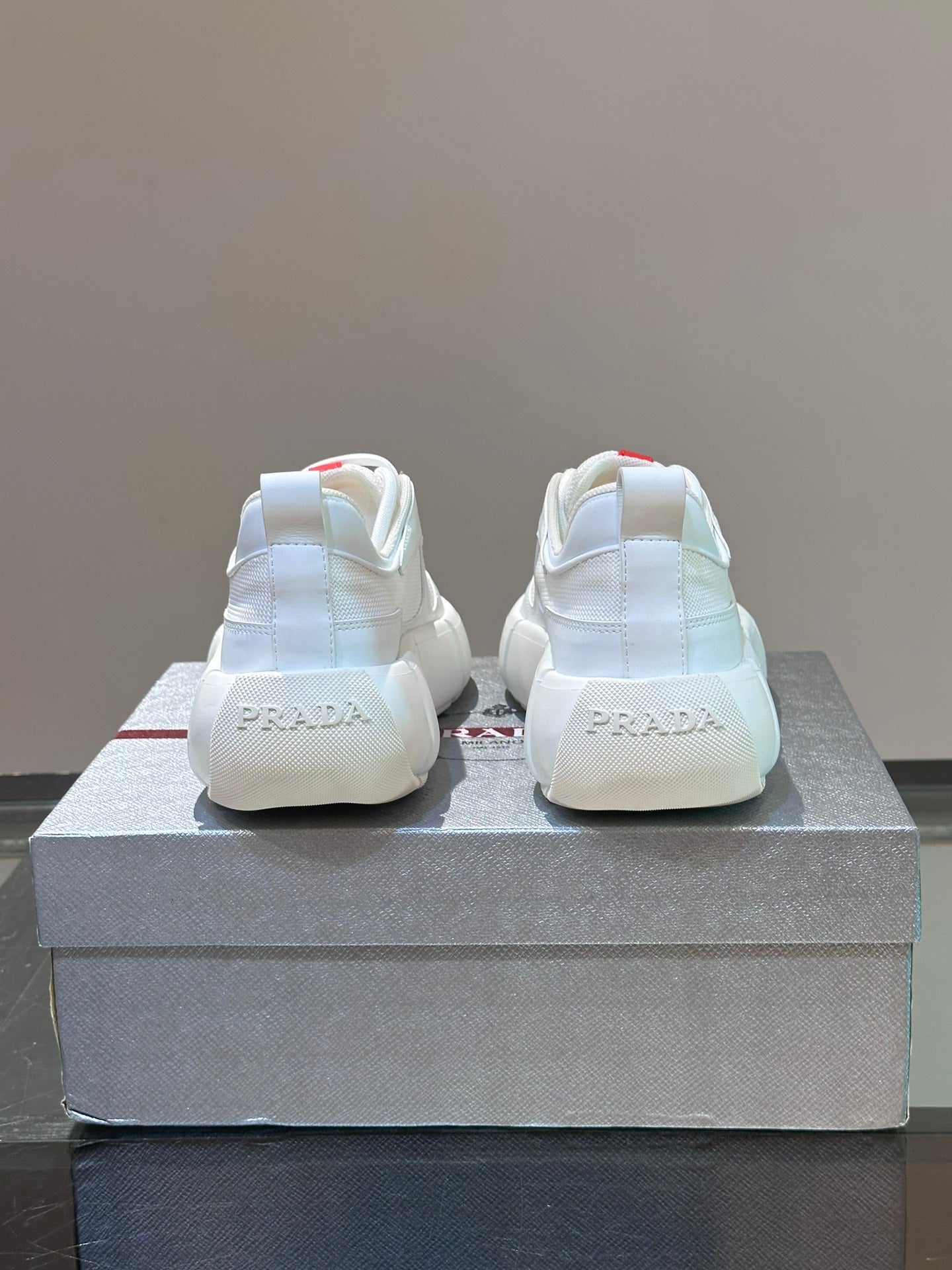 • Material: Cowhide Upper with Breathable Mesh Panels, Soft and Comfortable, Breathable Tongue Decorated with PRADA Brand Letter Logo, Rubber Thick Sole with Red Tag Tongue Echo