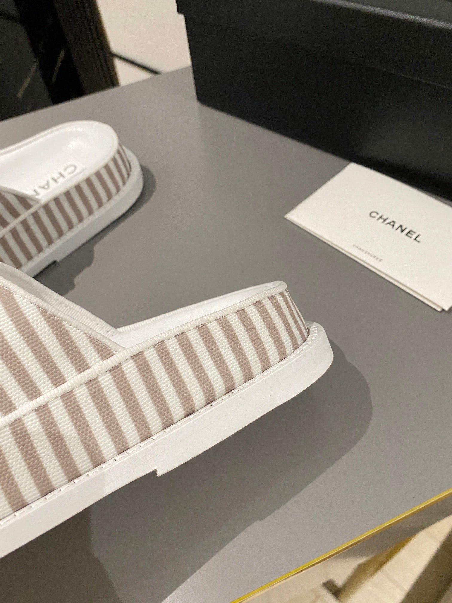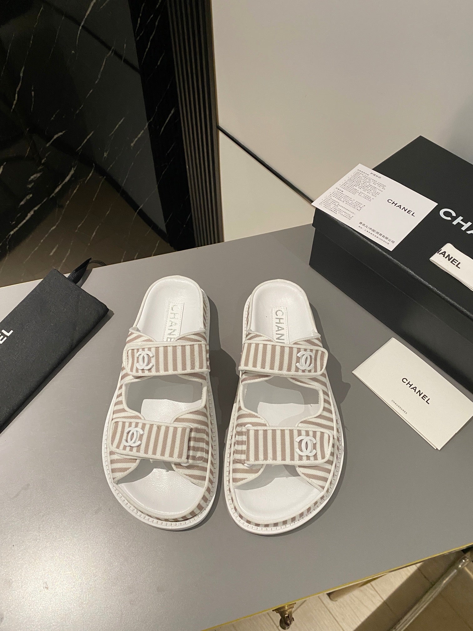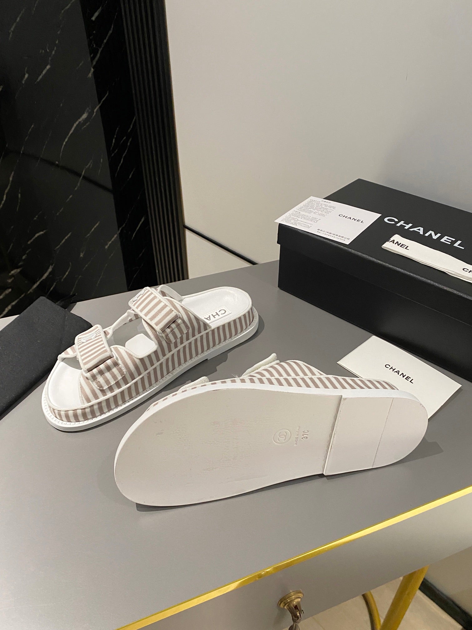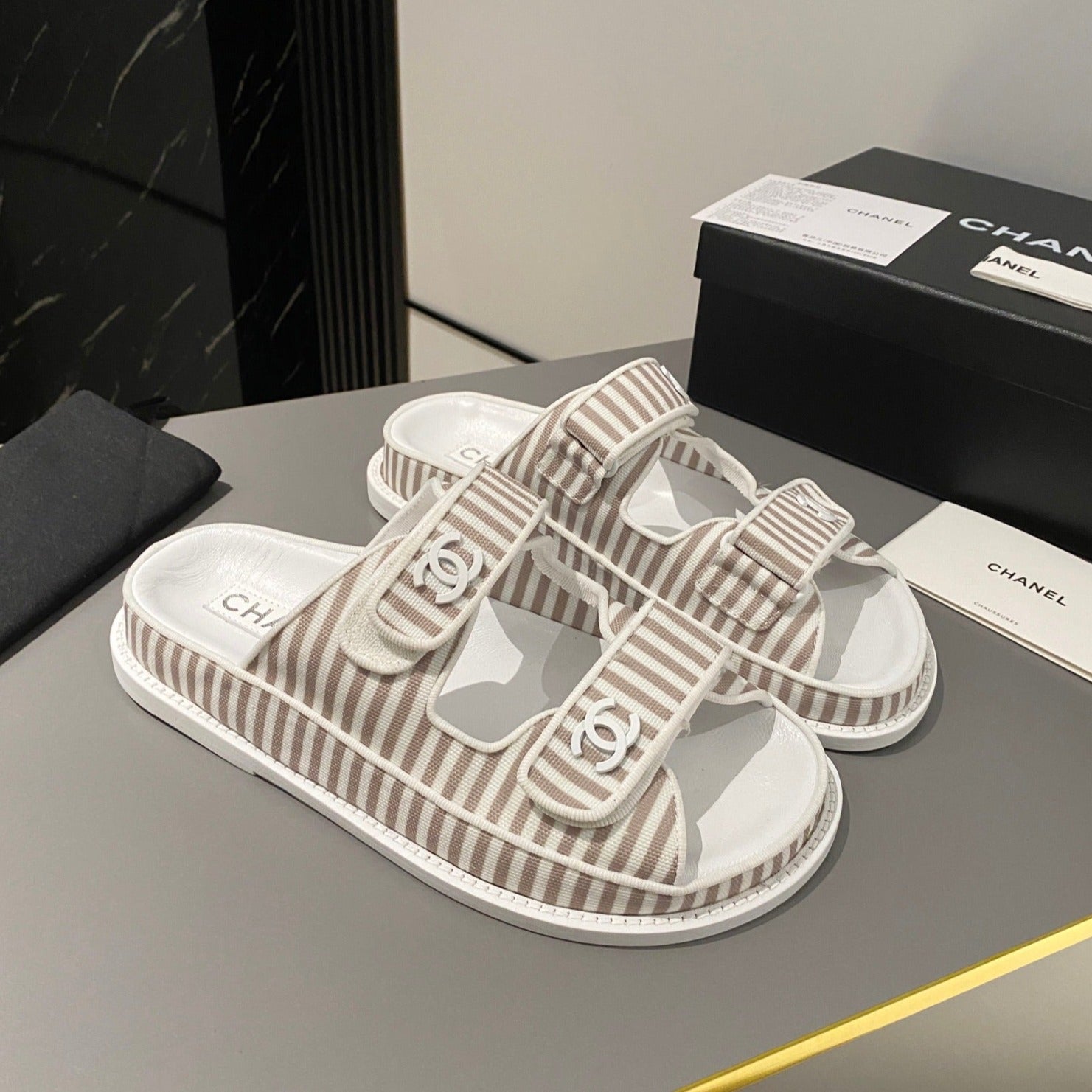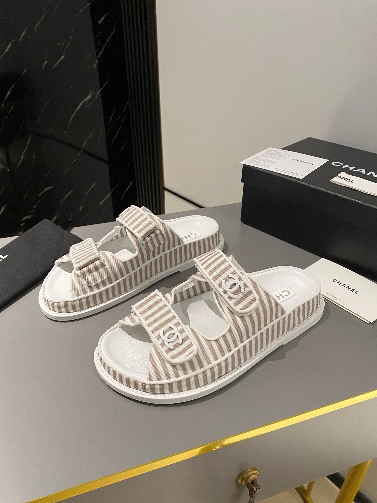 dad sandal mule striped brown white fabric calfskin