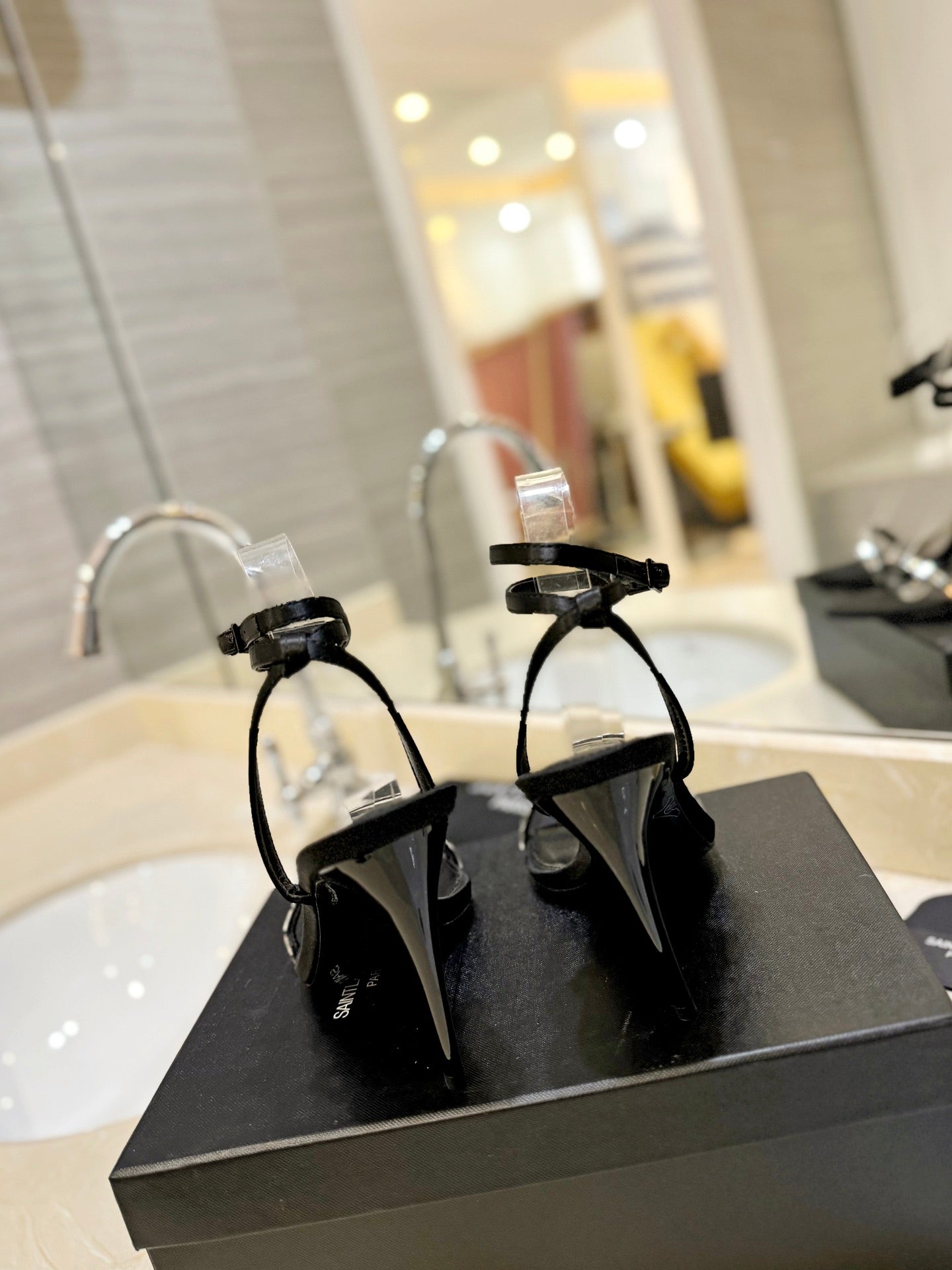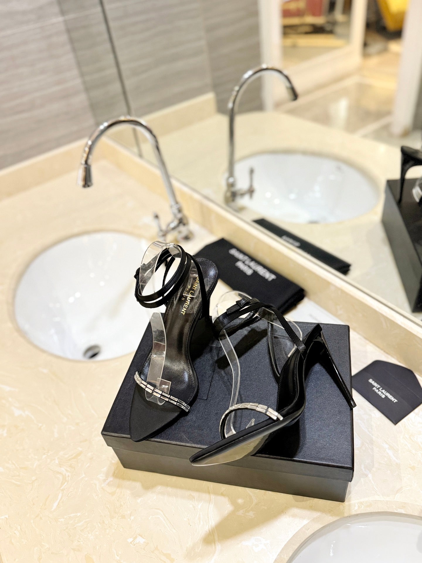 SL RHINESTONE HEELED SANDALS BLACK SATIN