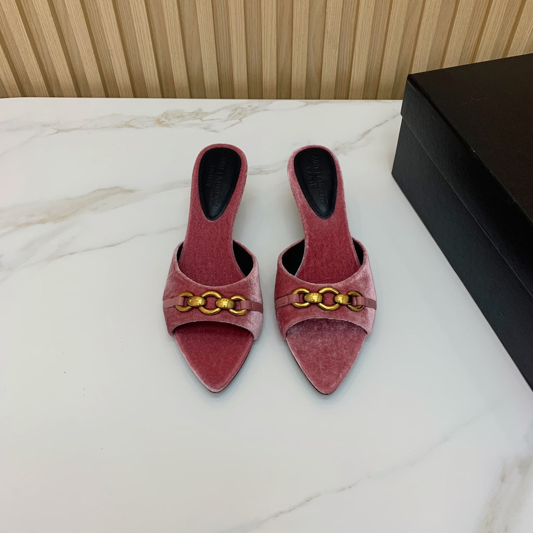 SL CHAIN ATTACH HEELED MULES BLUSH PINK VELVET
