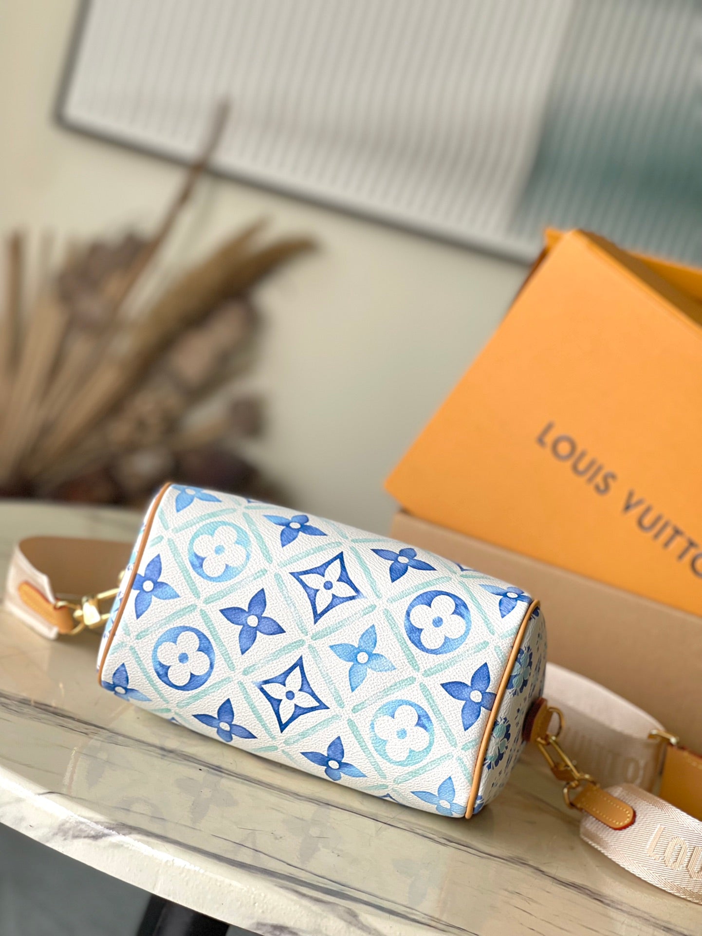 SPEEDY BANDOULIÈRE 20 IN TELA CON PIASTRELLE MONOGRAM BLU LAGUNA E FIBBIA ORO