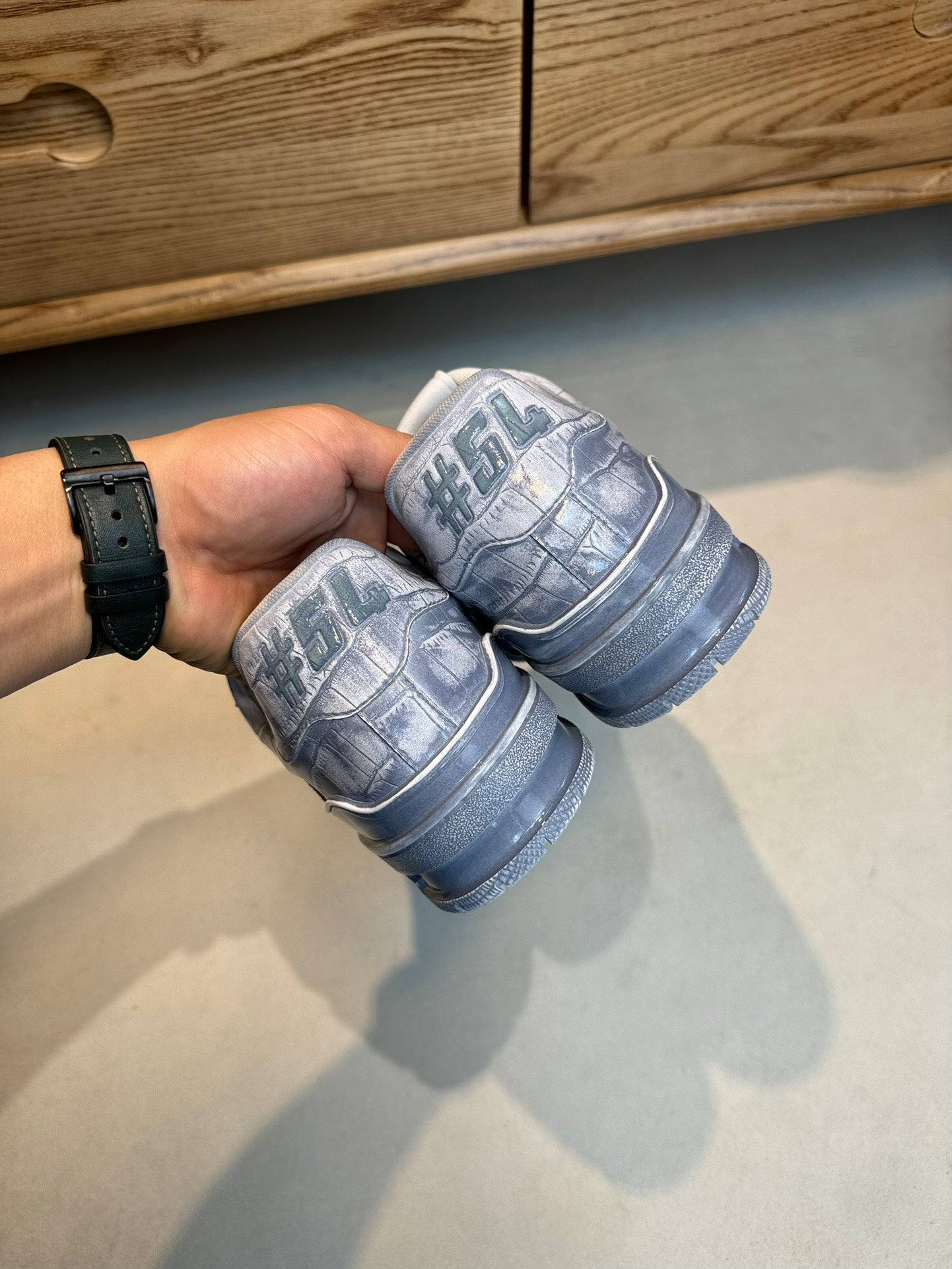 • Tomaia: "Pelle bovina grana pietra, tecnica cangiante, con logo in plastica sulla tomaia e sulla linguetta della scarpa."