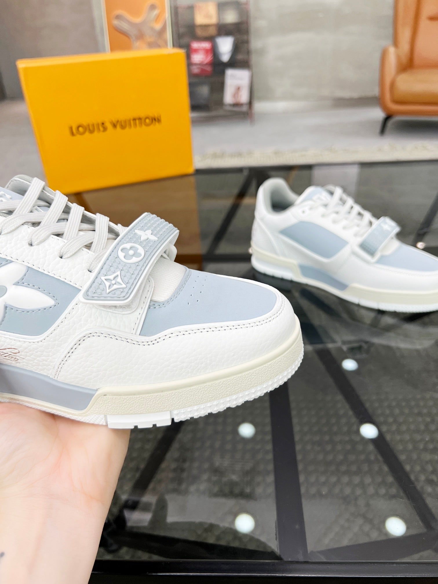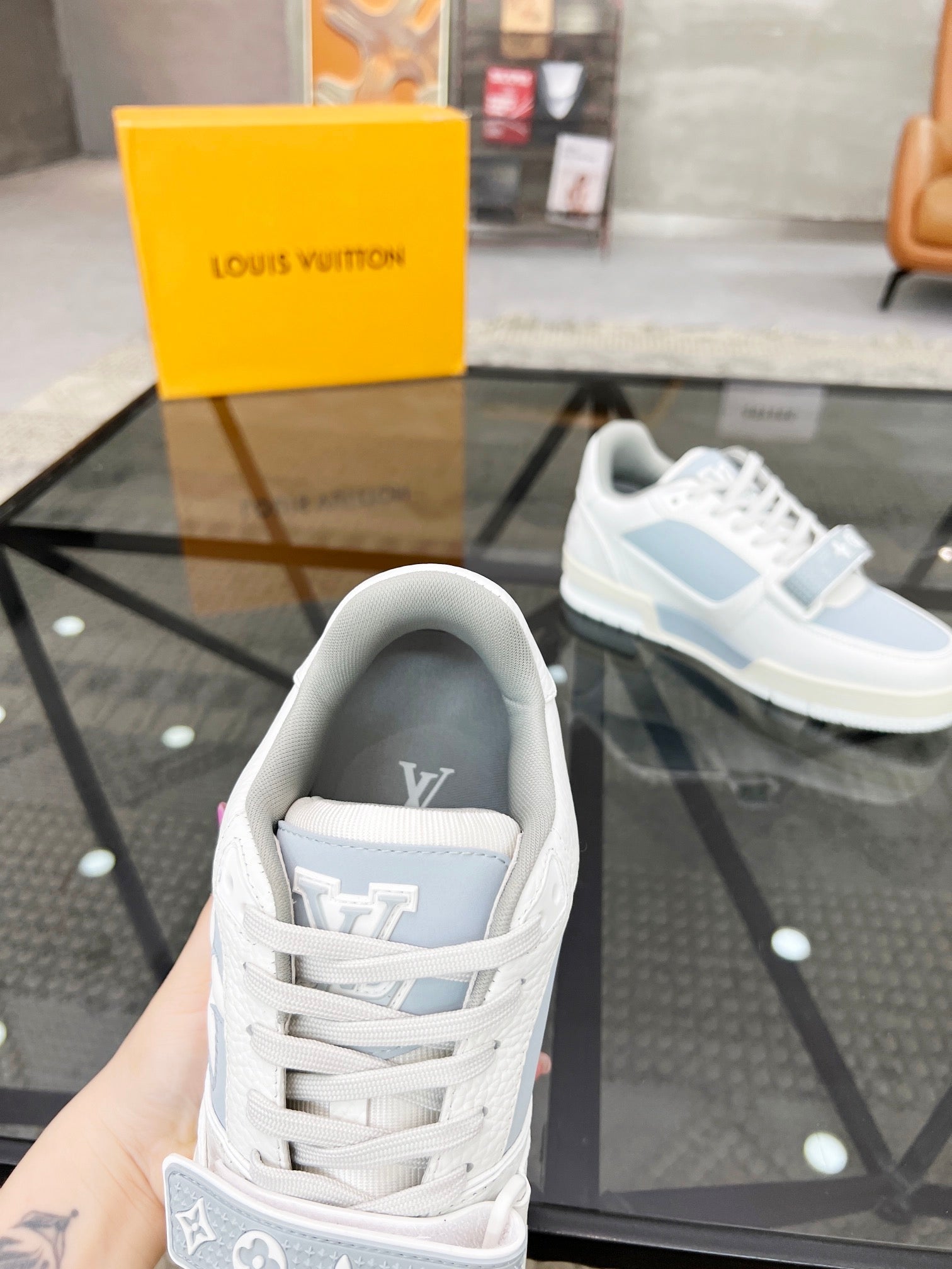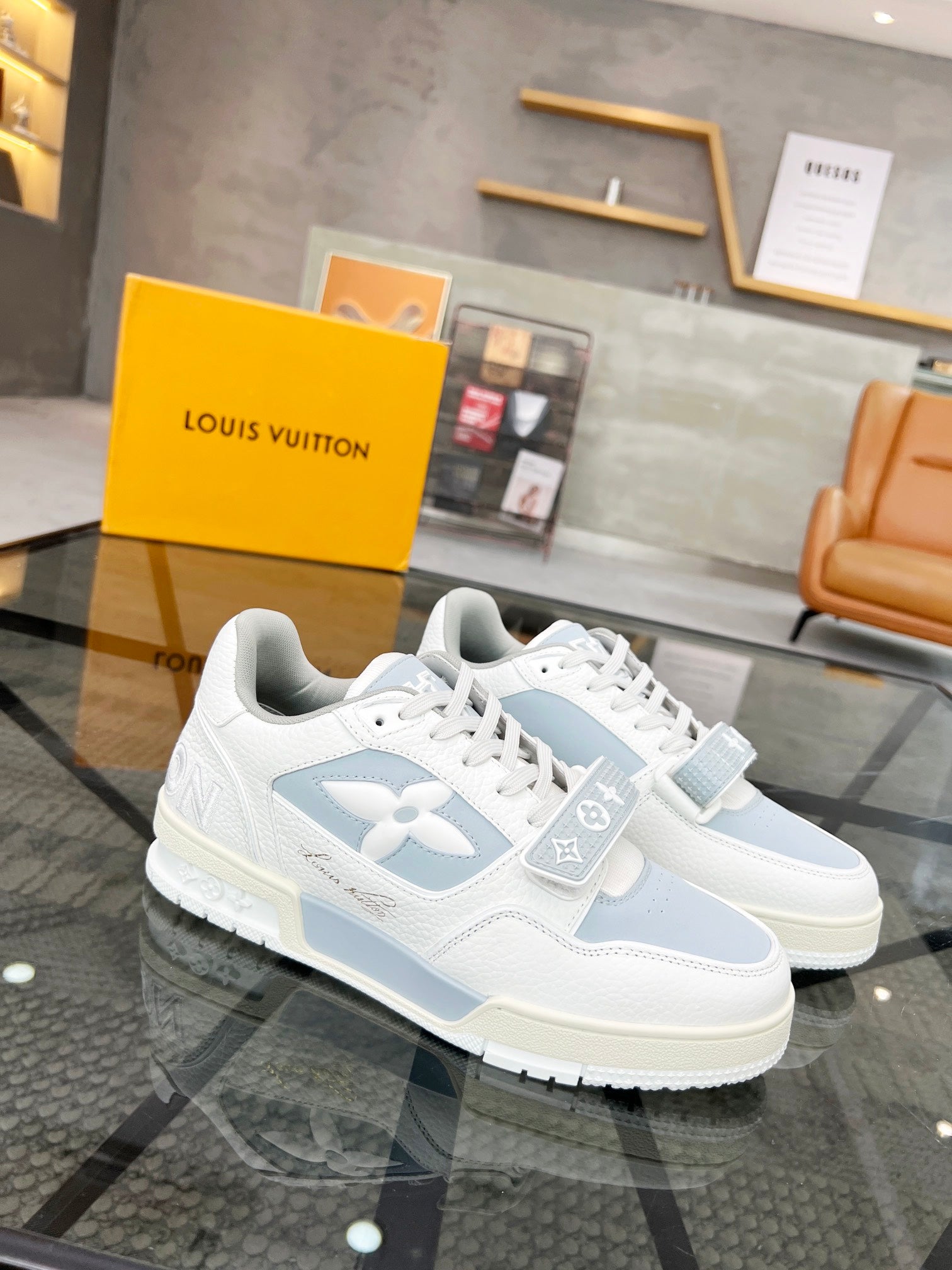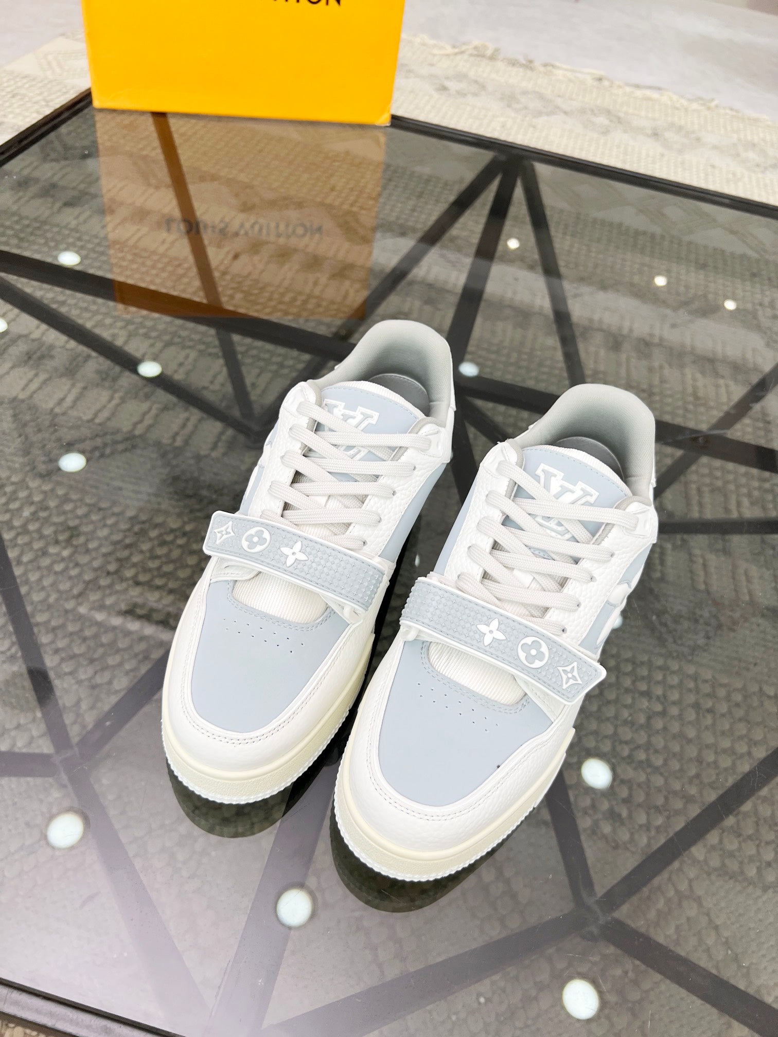 SNEAKER LV TRAINER IN PELLE DI VITELLO BIANCA E CAMOSCIO AZZURRO