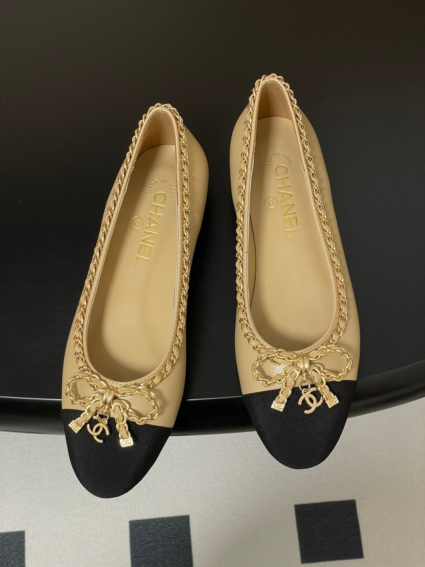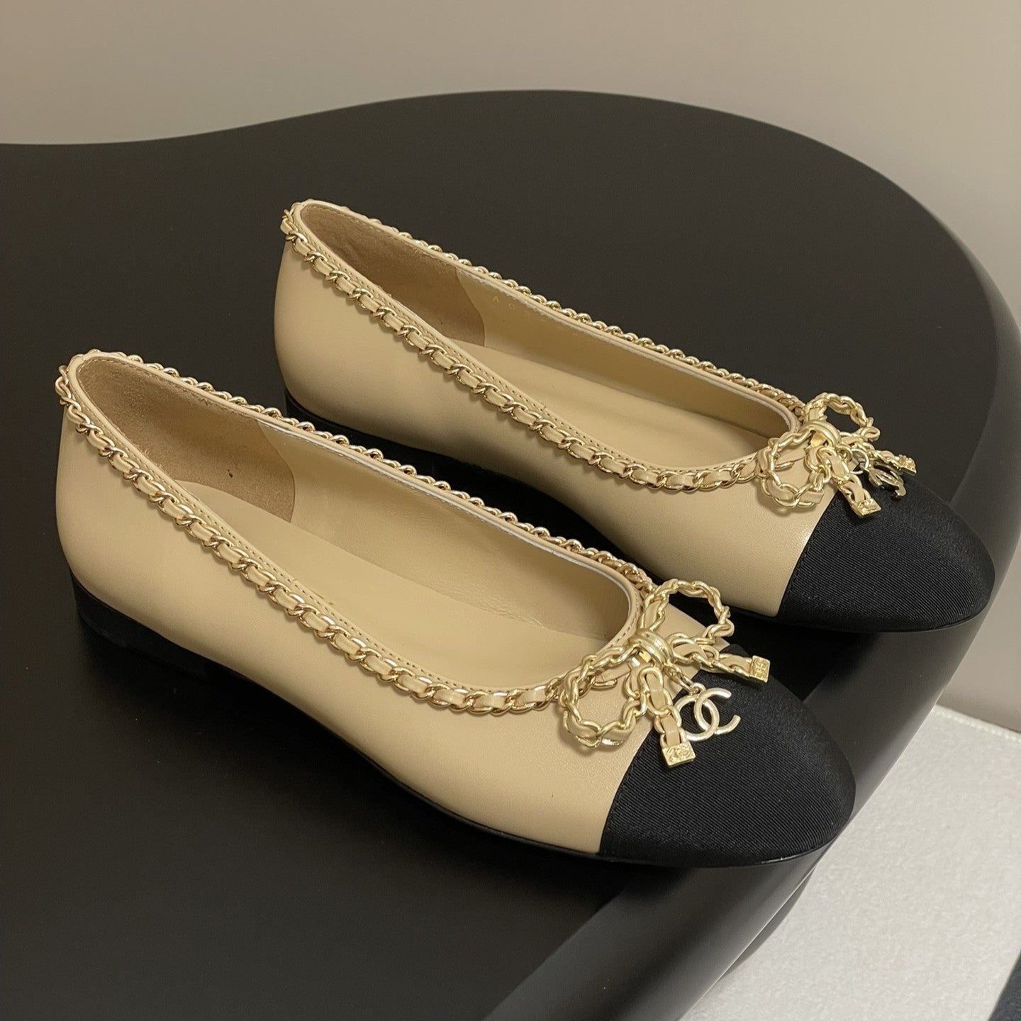 CC 25S 20mm Catena Fiocco Singolo Piatto Beige Pelle di Pecora Grosgrain Nero 247654