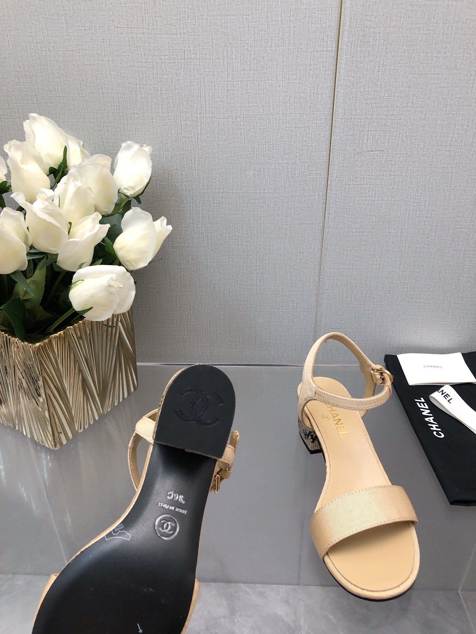 SANDALO CON TACCO A BLOCCO E CRISTALLI 5 CM IN TESSUTO MARRONE SABBIA