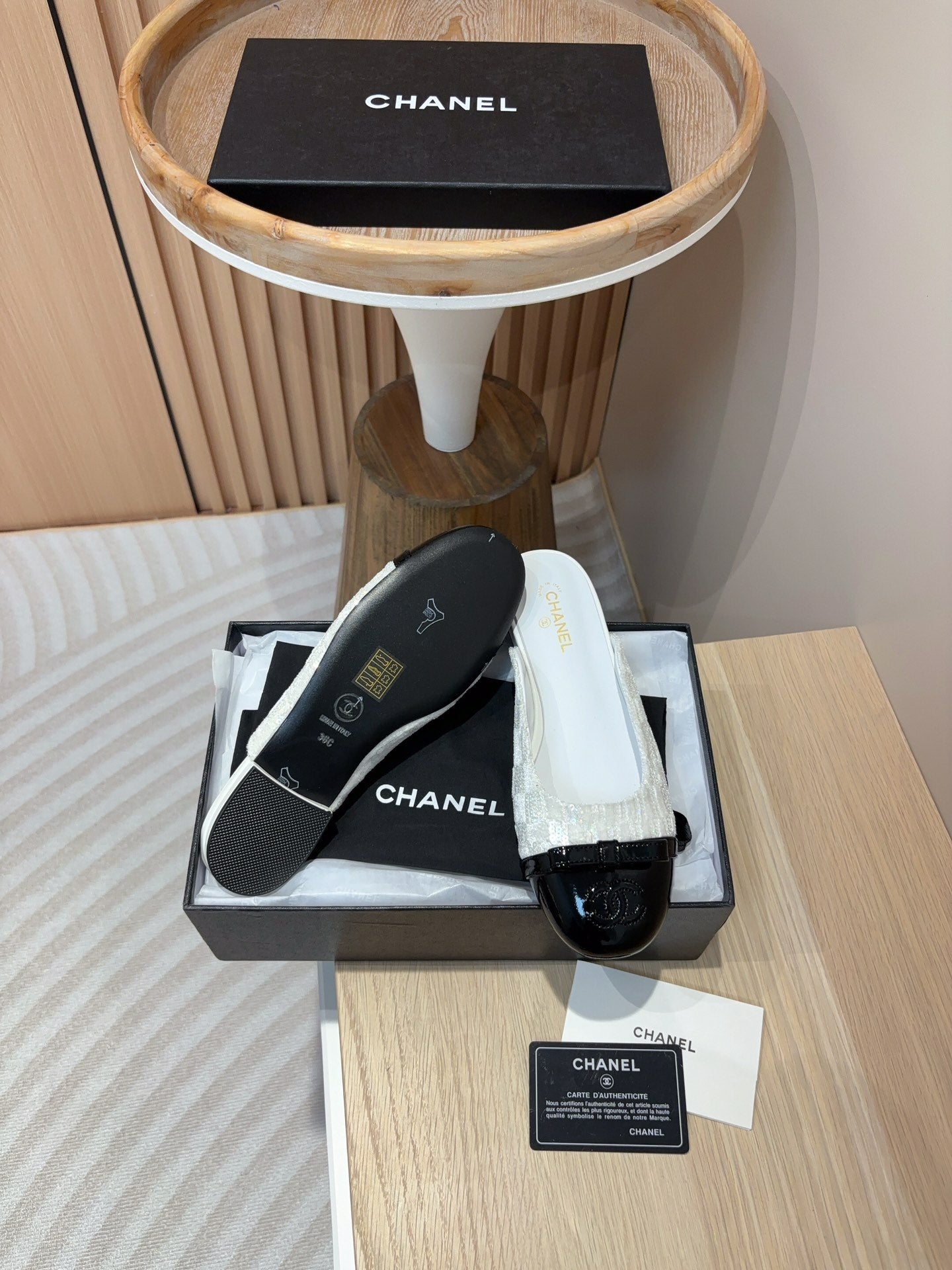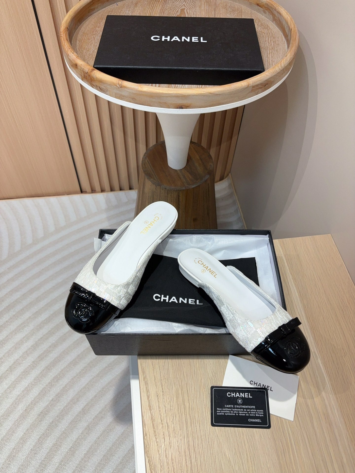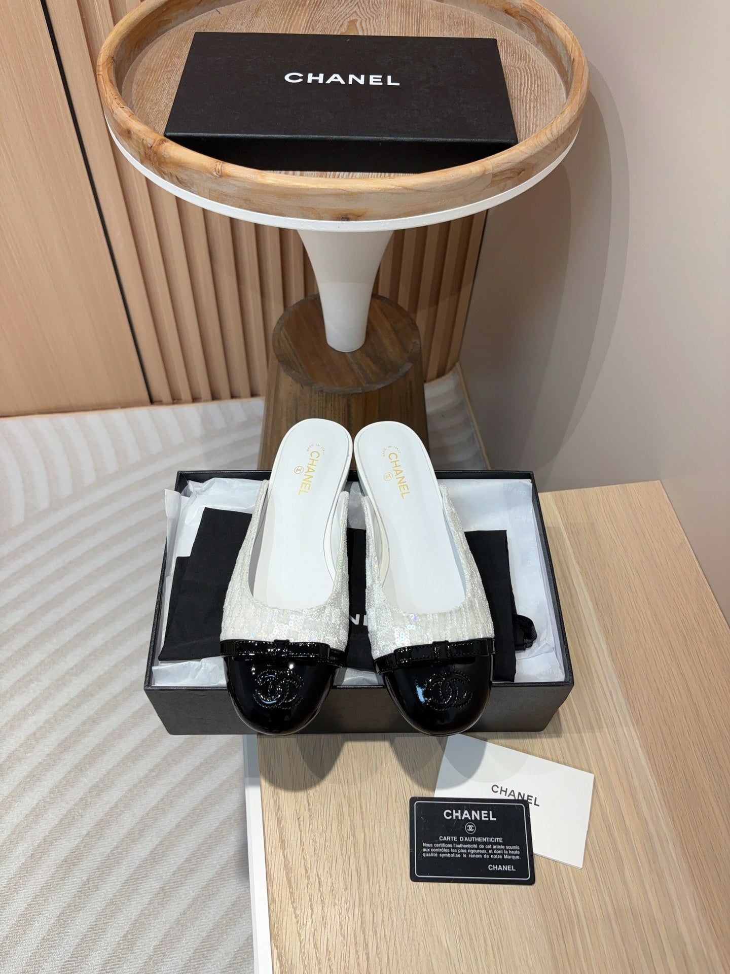 cc mule tweed bianco paillettes pelle di vitello verniciata nera
