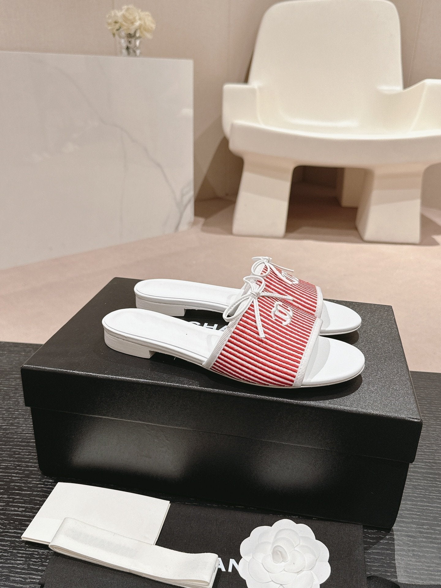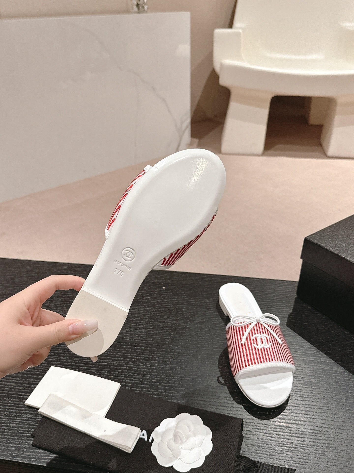 sandalo mulo in tela di vitello a righe rosse e bianche