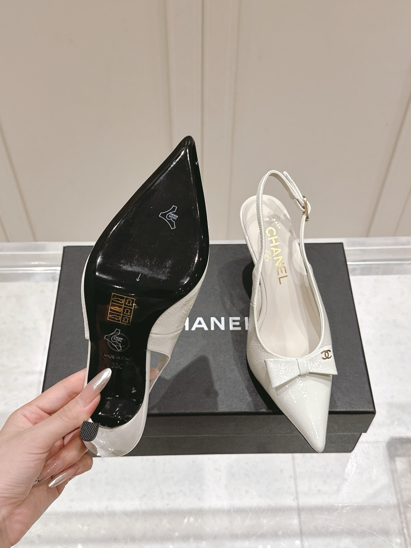 Chanel 25A Slingback in pelle di vitello verniciata bianca 393072