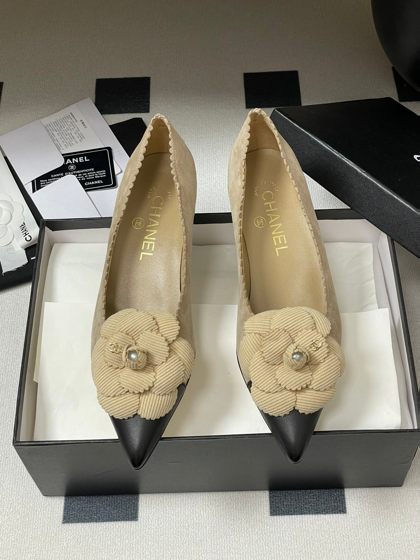 CC 25C Classic Camellia Scarpe con tacco alto a punta 35 mm in pelle scamosciata beige 247612