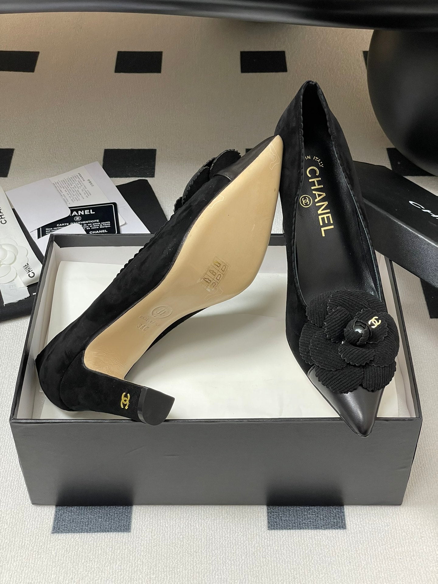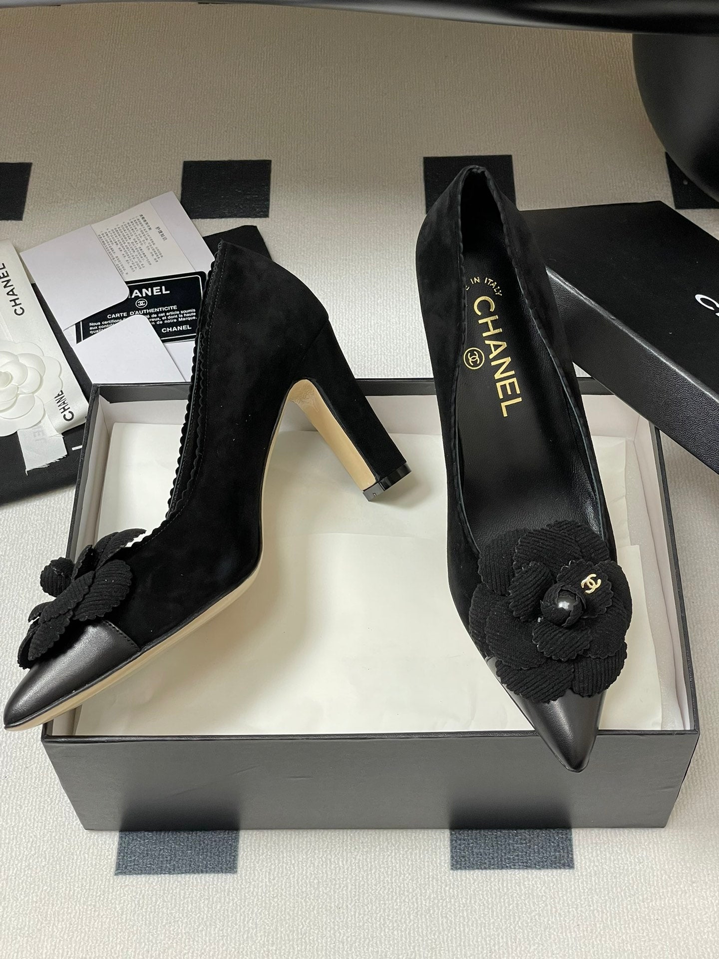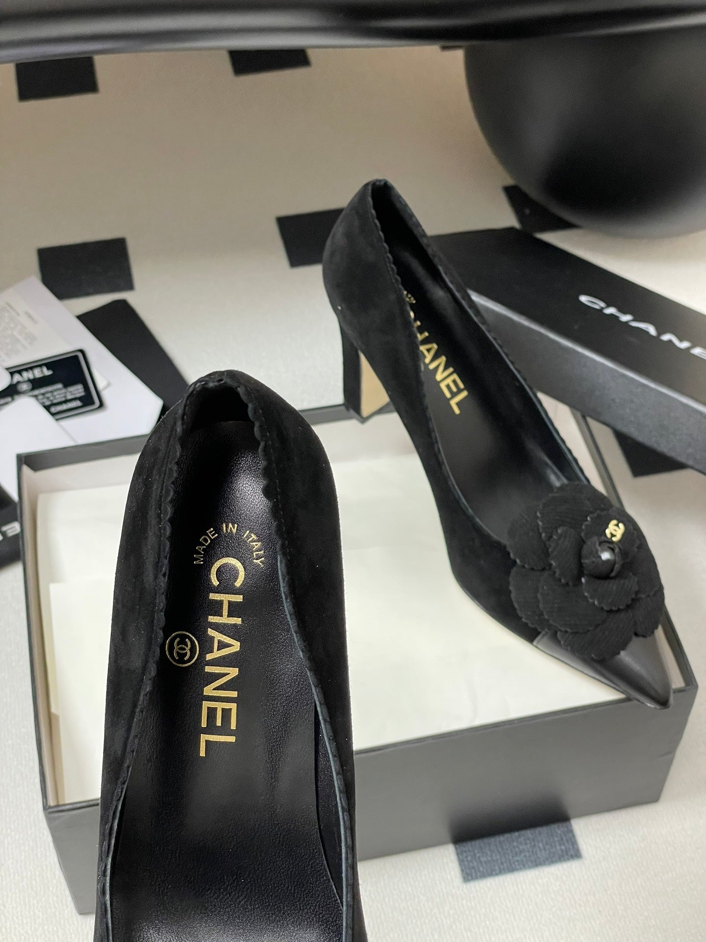 CC 25C Classic Camellia Scarpe con tacco alto a punta 85mm in pelle scamosciata nera 247617