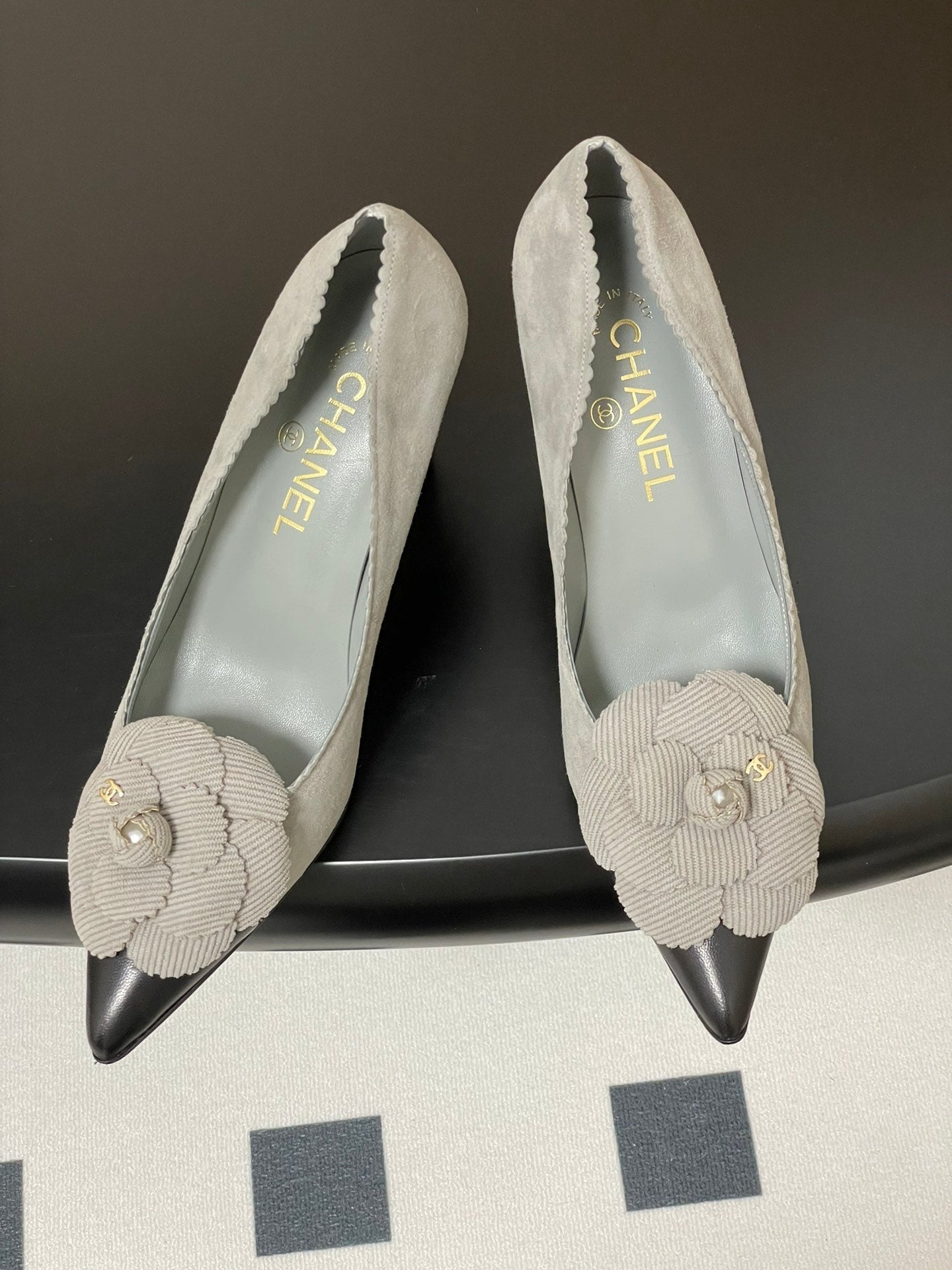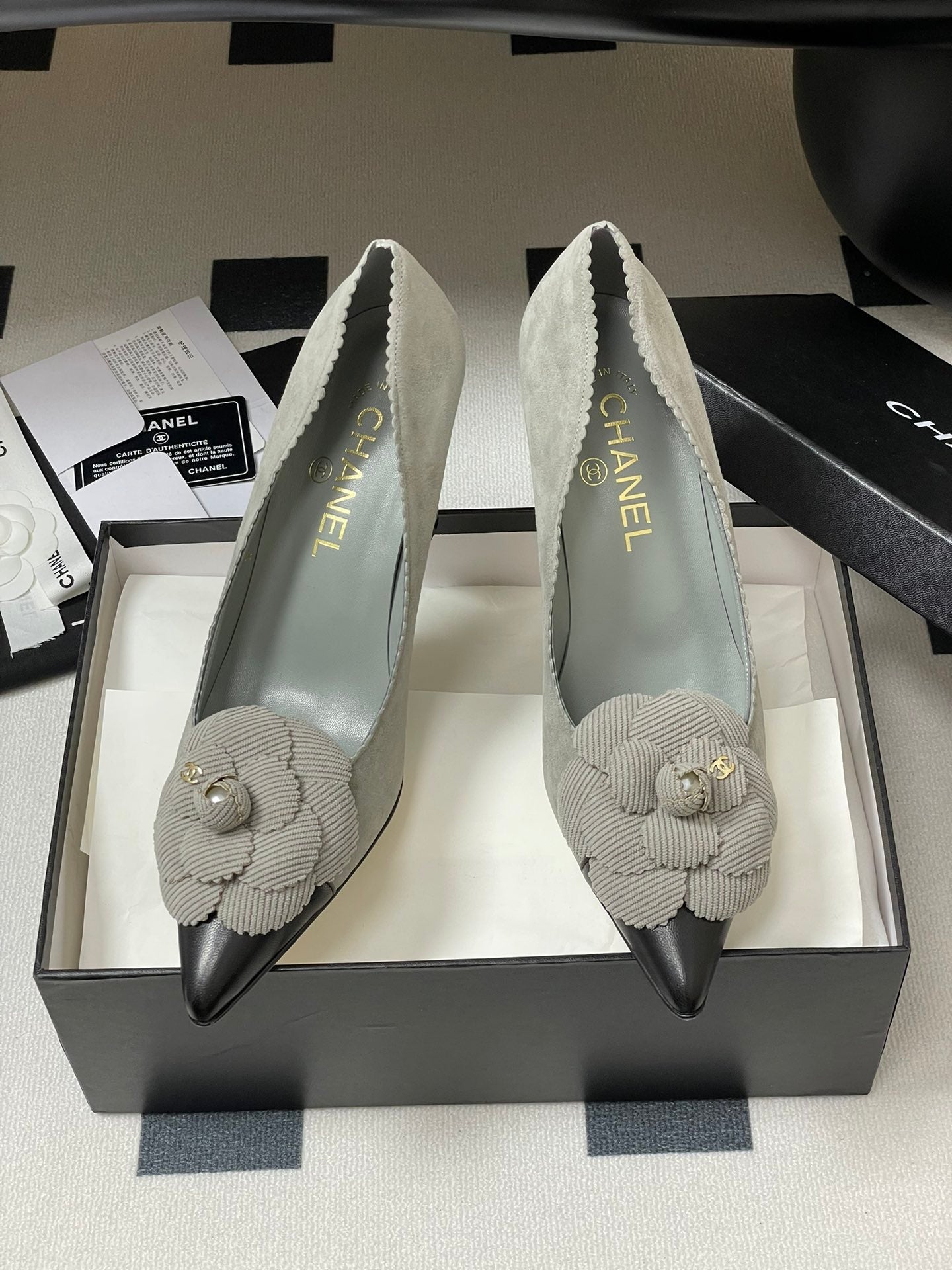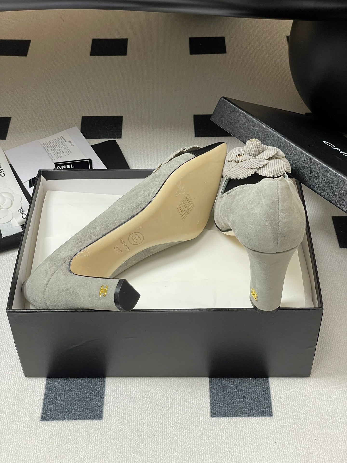 CC 25C Classic Camellia Scarpe con tacco alto a punta 85mm in pelle scamosciata grigia 247615