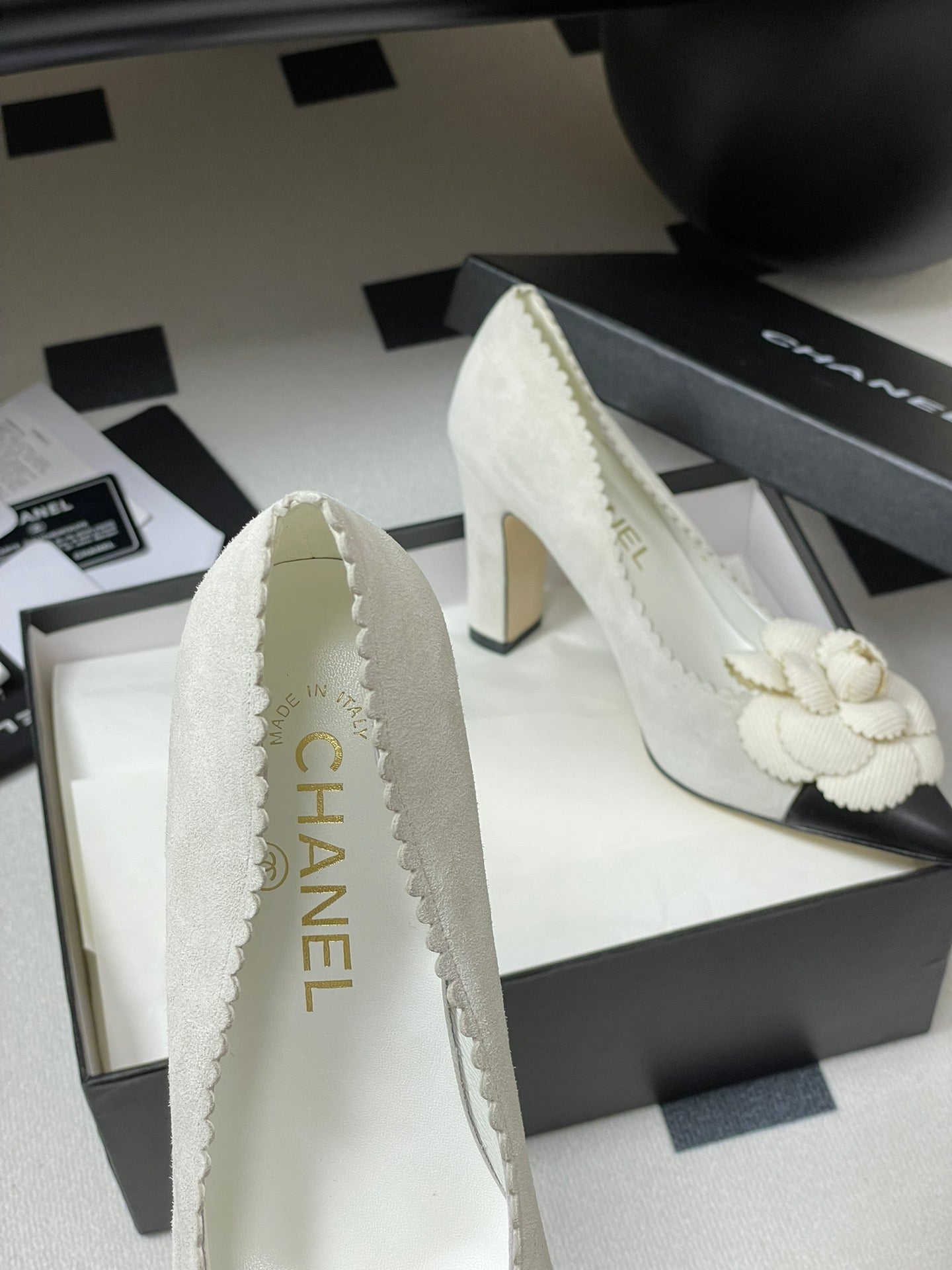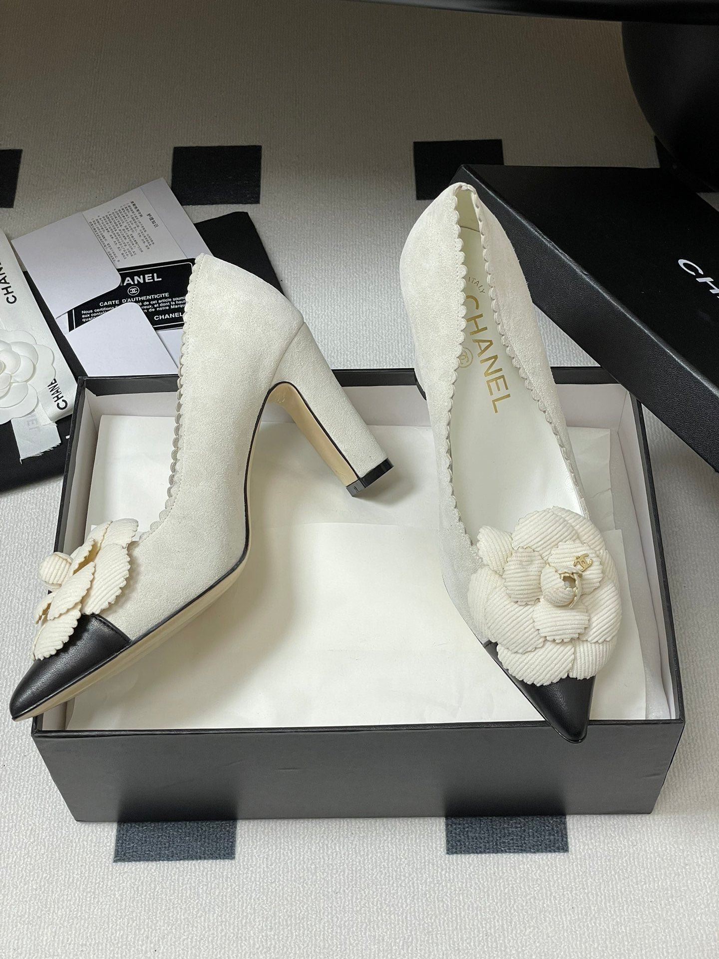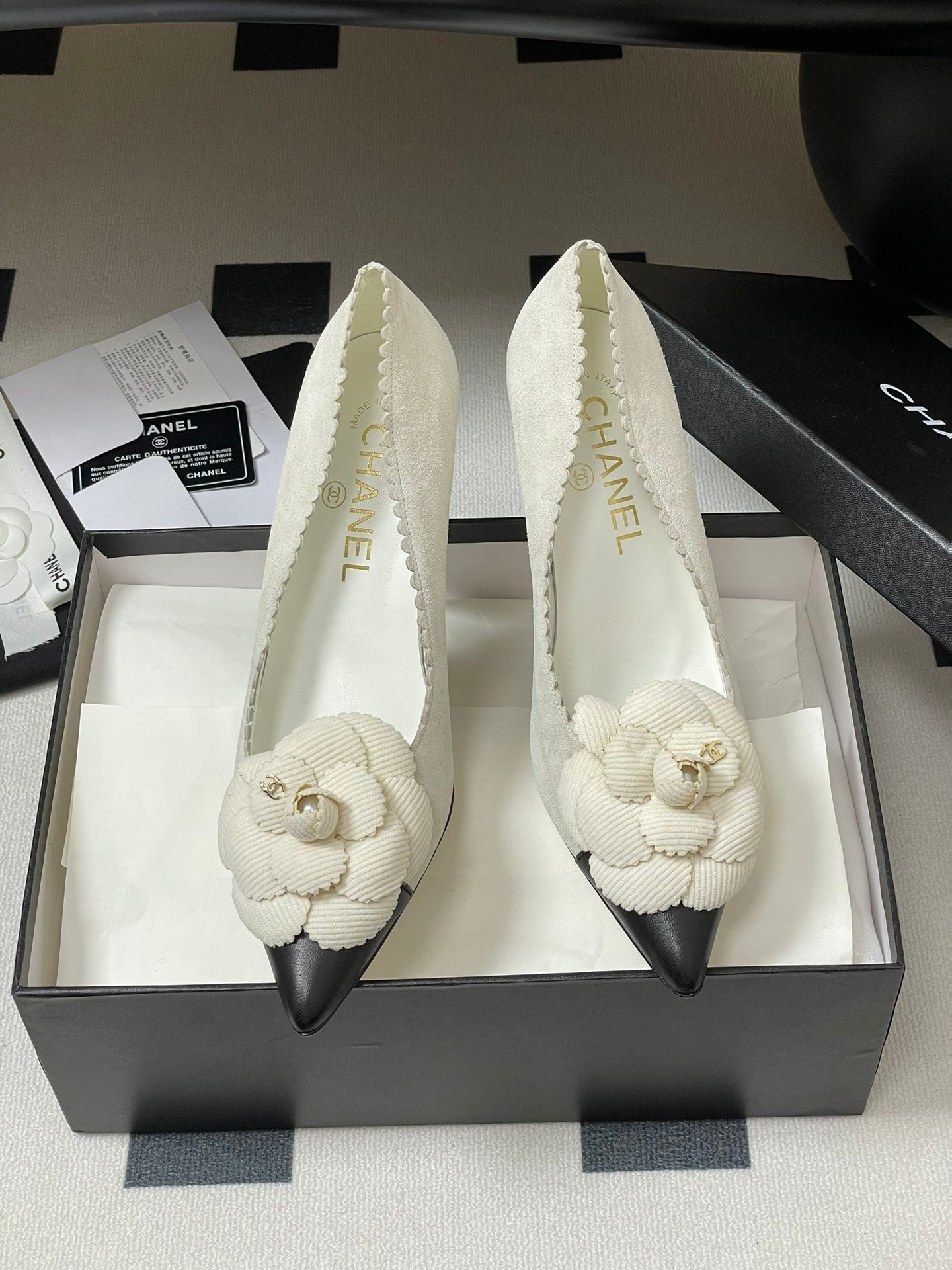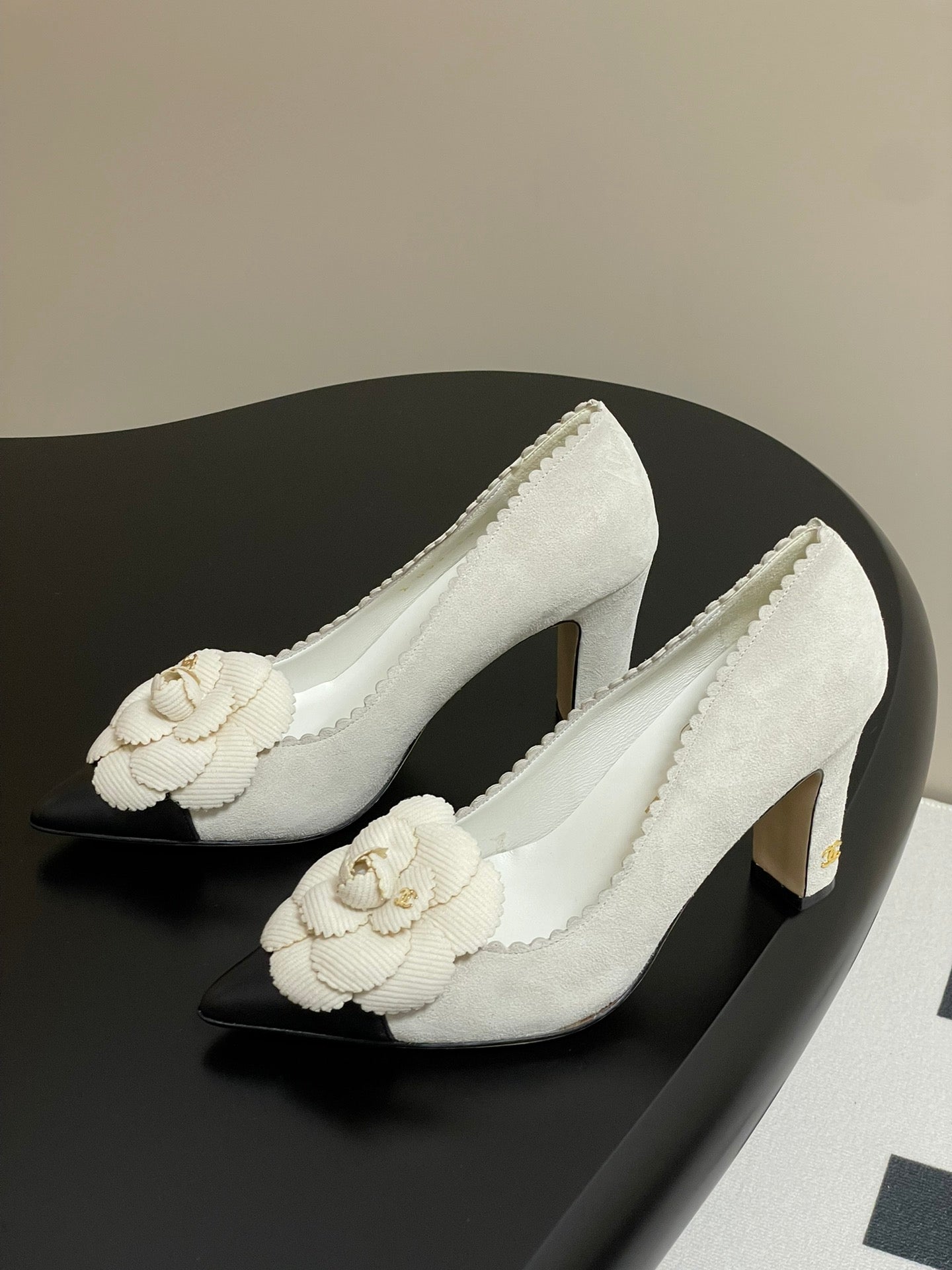CC 25C Classic Camellia Scarpe con tacco alto a punta 85mm in pelle scamosciata bianca 247616