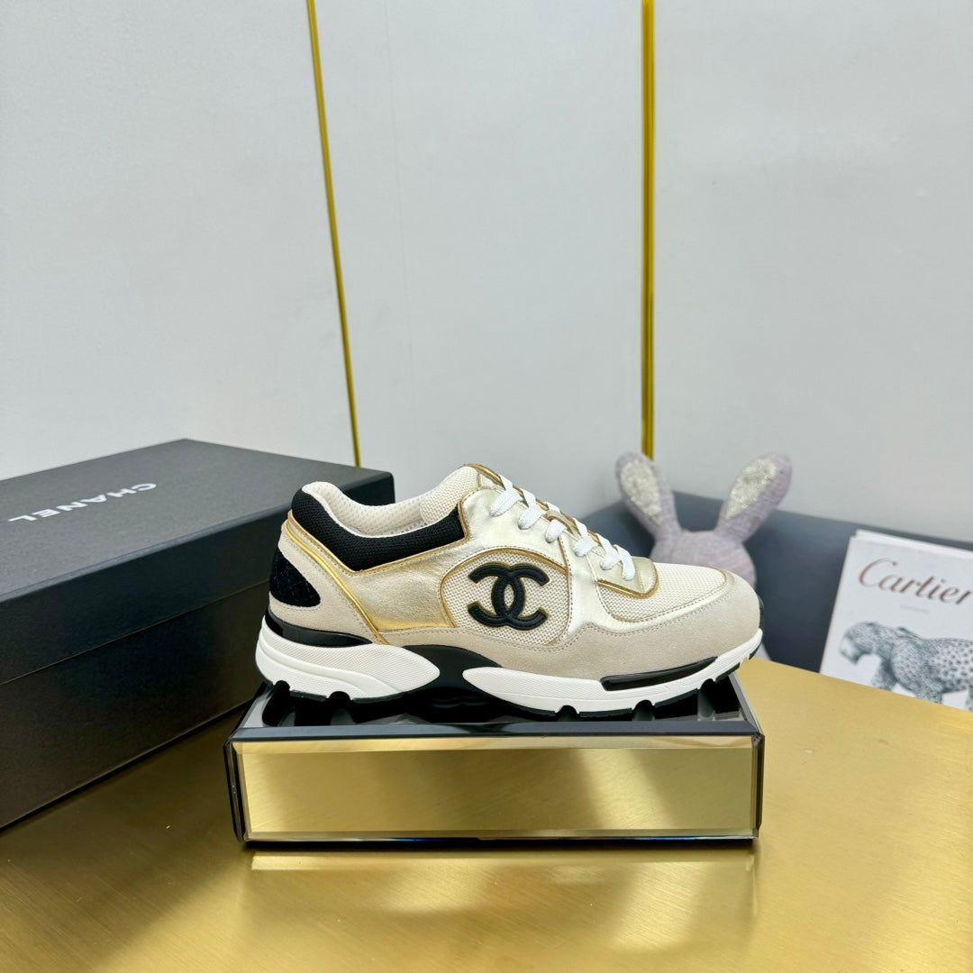 sneaker da donna cc in tweed di lana oro chiaro, vitello oro e vitello scamosciato beige 137569
