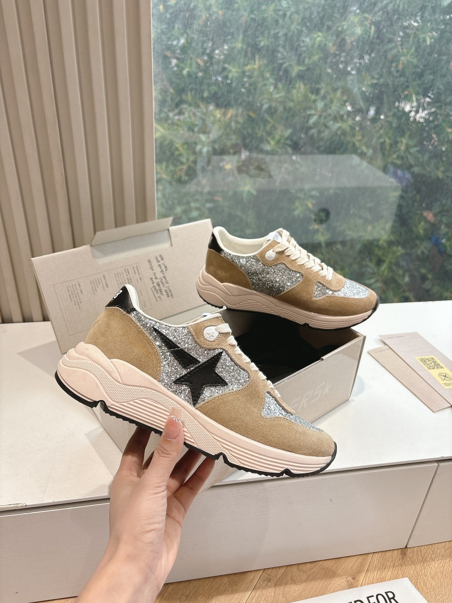 SNEAKERS CON SUOLA DA RUNNING IN GLITTER ARGENTO E PECAN PIE IN CAMOSCIO NERO CON STELLA IN PELLE DI VITELLO