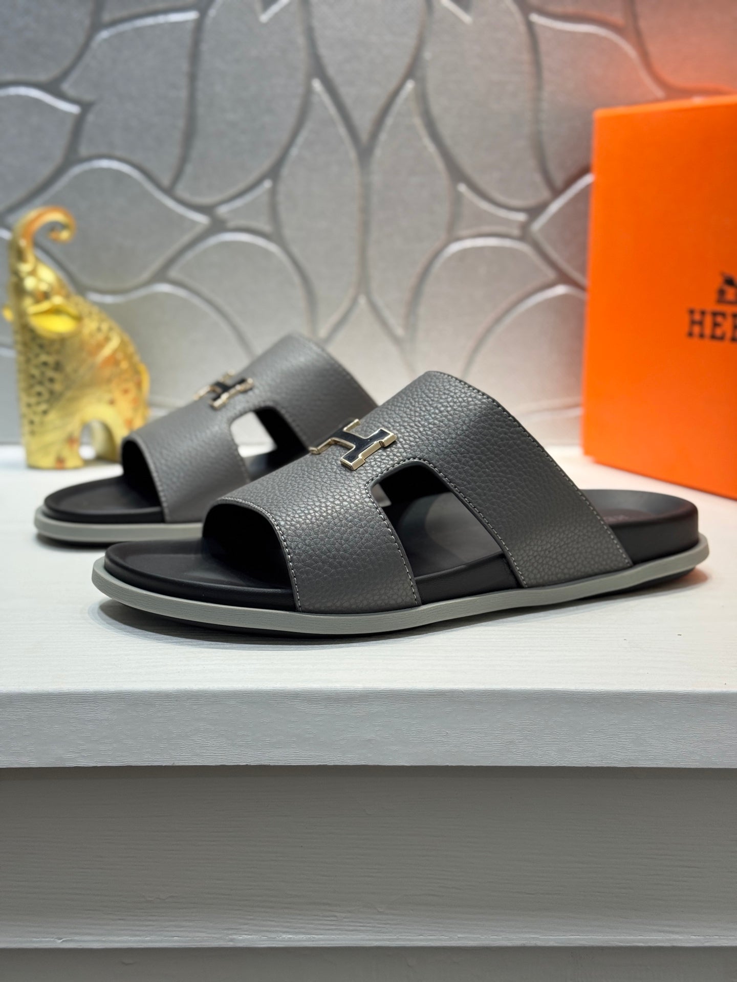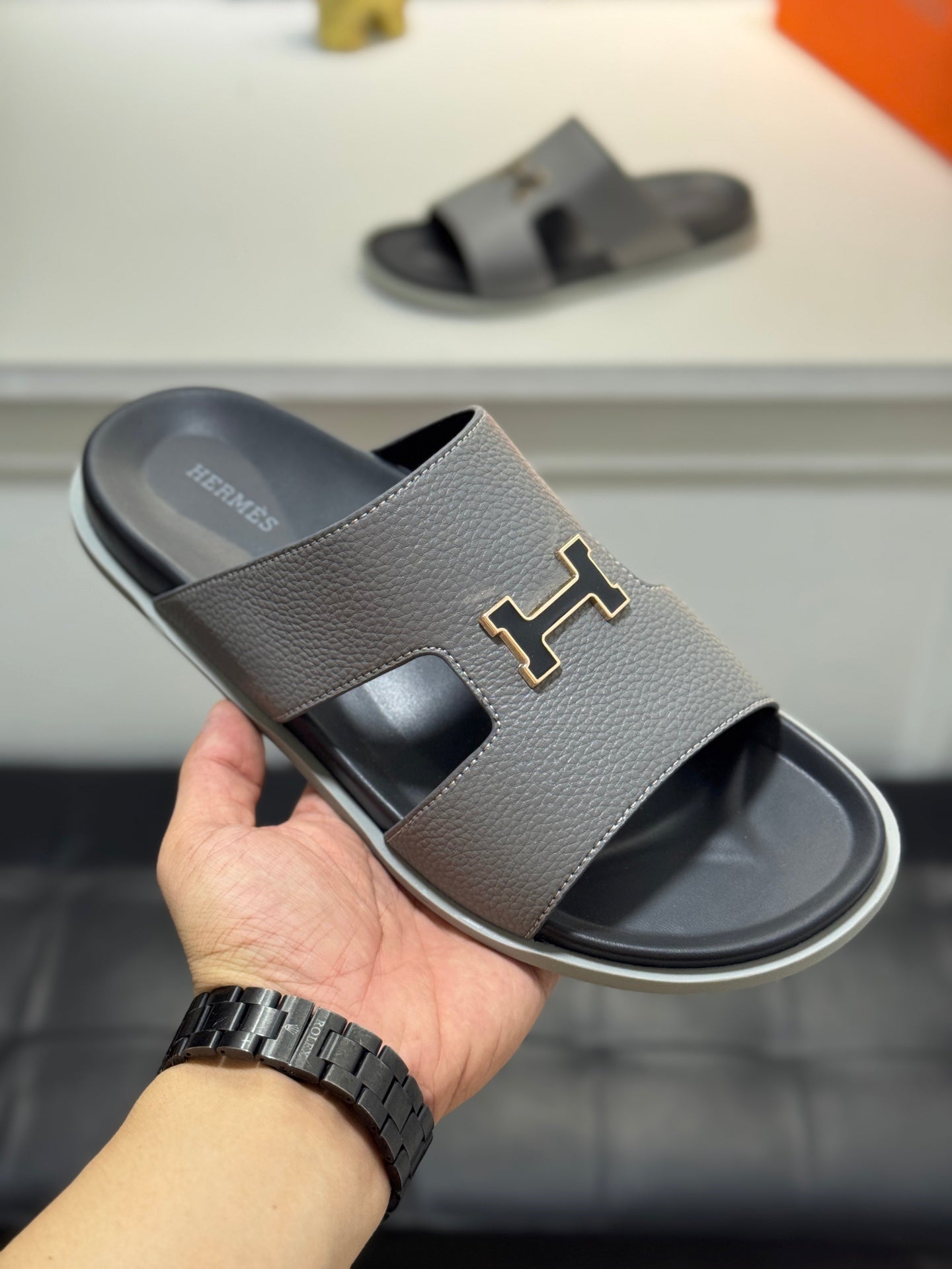Pantofole HM Oran H con fibbia in oro nero in pelle di vacchetta grigia 735245