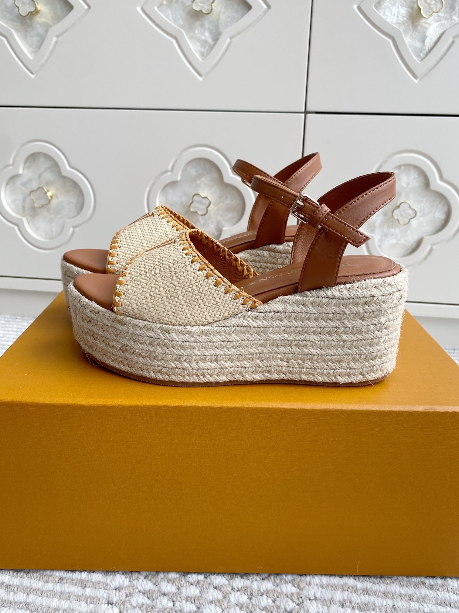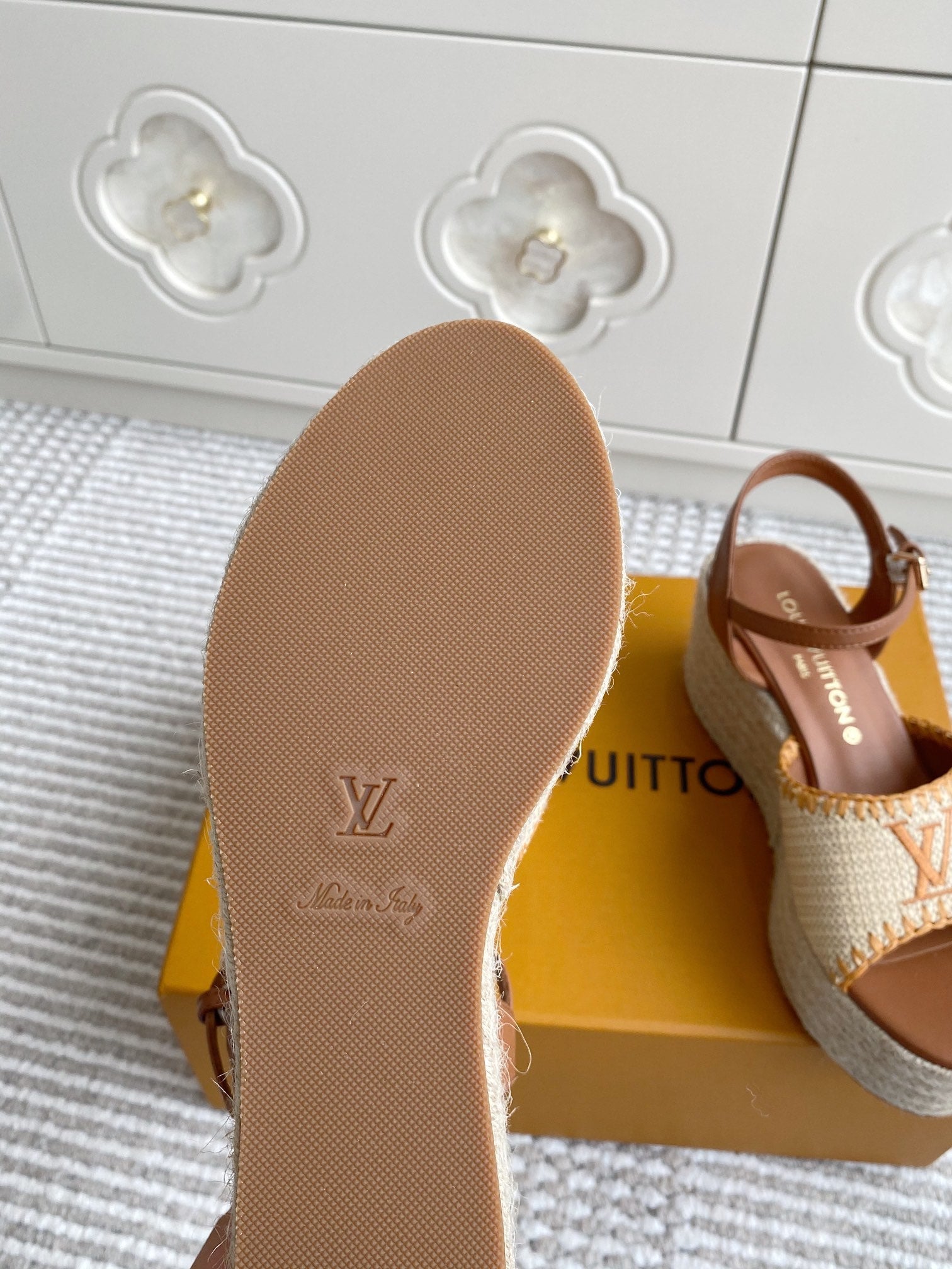 Sandali con zeppa in rafia beige LV, 7,5 cm, fodera in pelle dorata, 291587