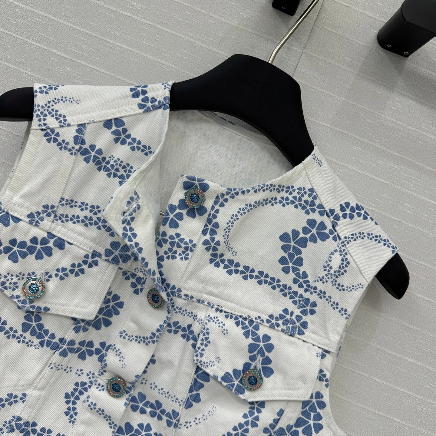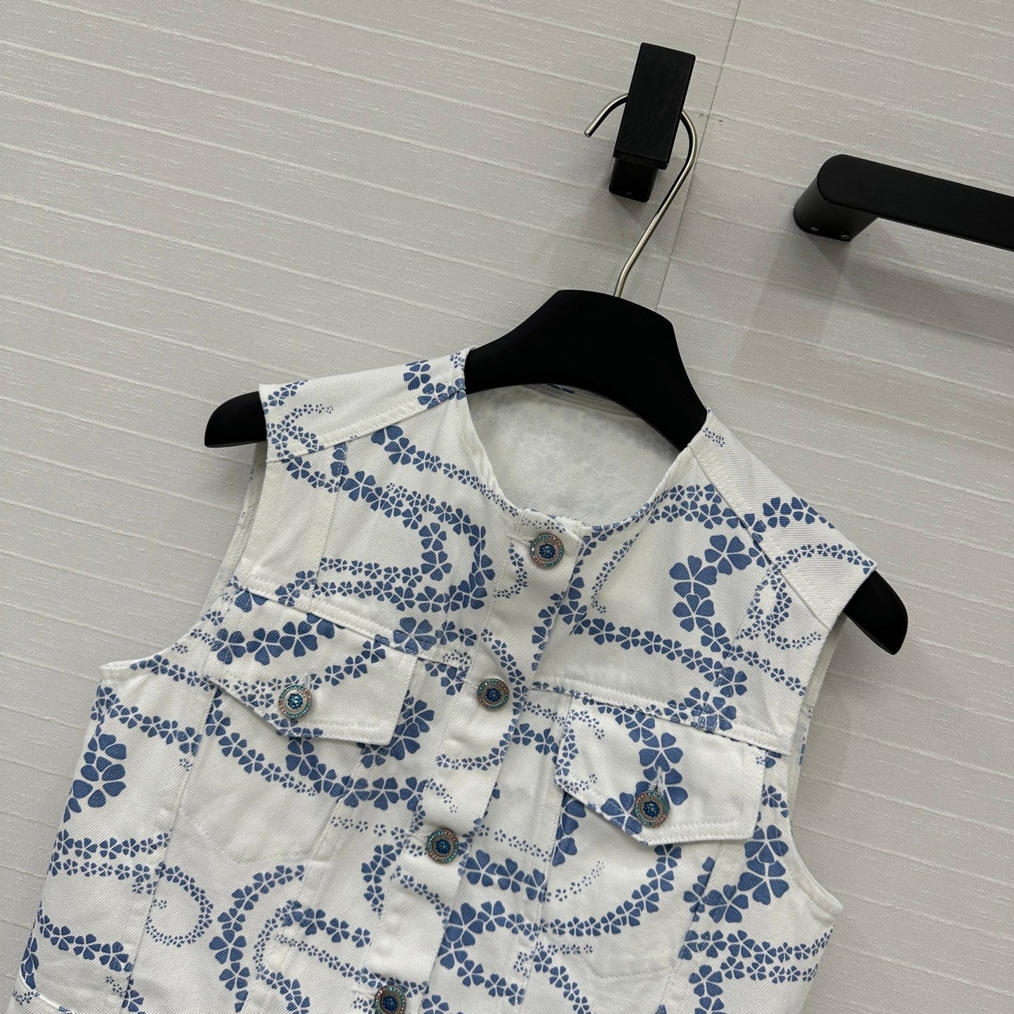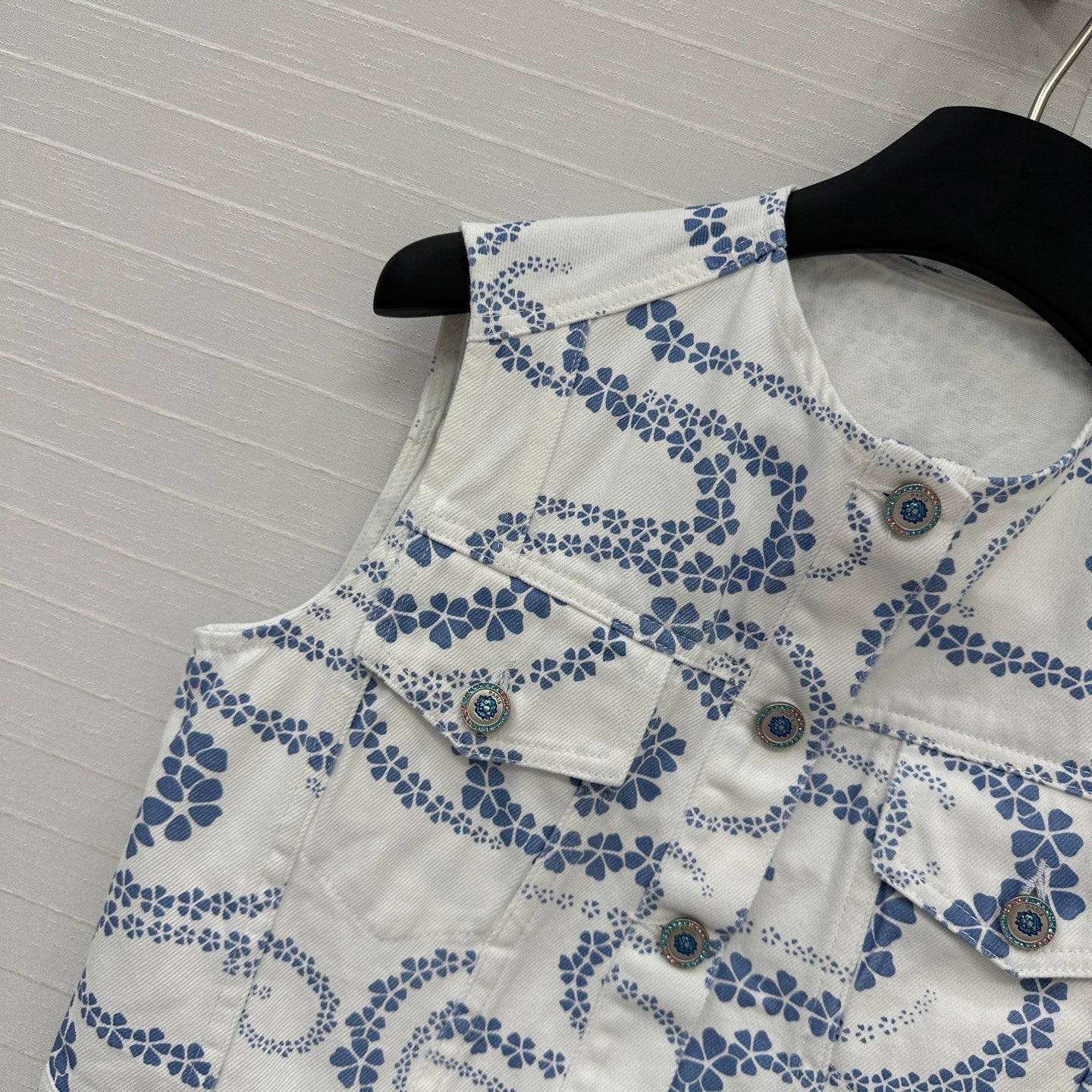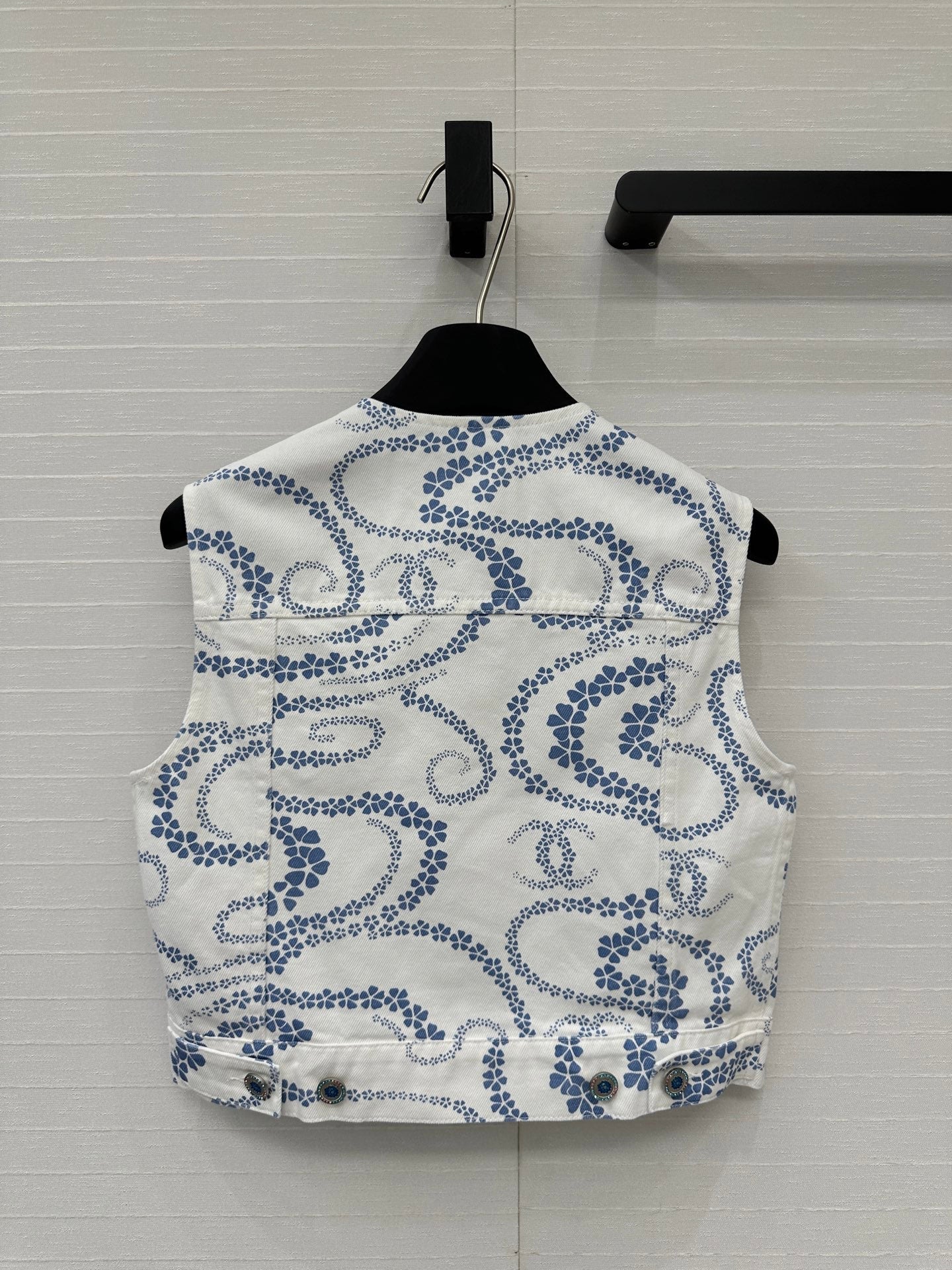 CC 25 Gilet in denim stampato con scollo rotondo, blu e bianco, in cotone