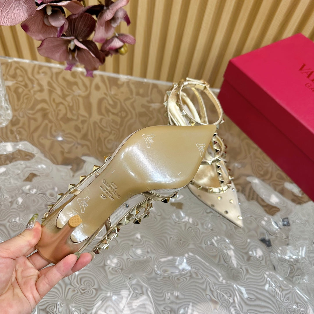 DÉCOLLETÉ ROCKSTUD EFFETTO SPECCHIO CON CINTURINI E BORCHIE COORDINATE 95 MM PELLE DI VITELLO ORO E RETE