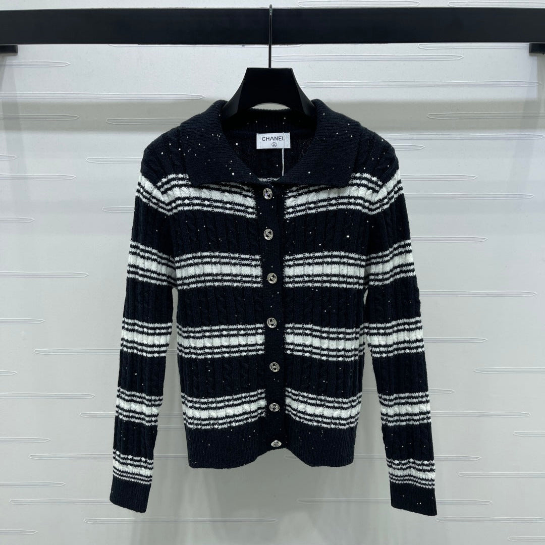 CC 25 Striped Knit Cardigan Black Wool