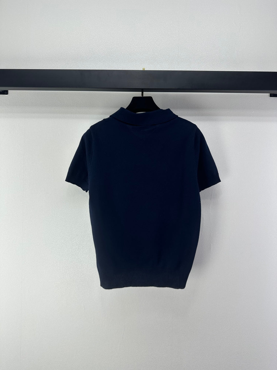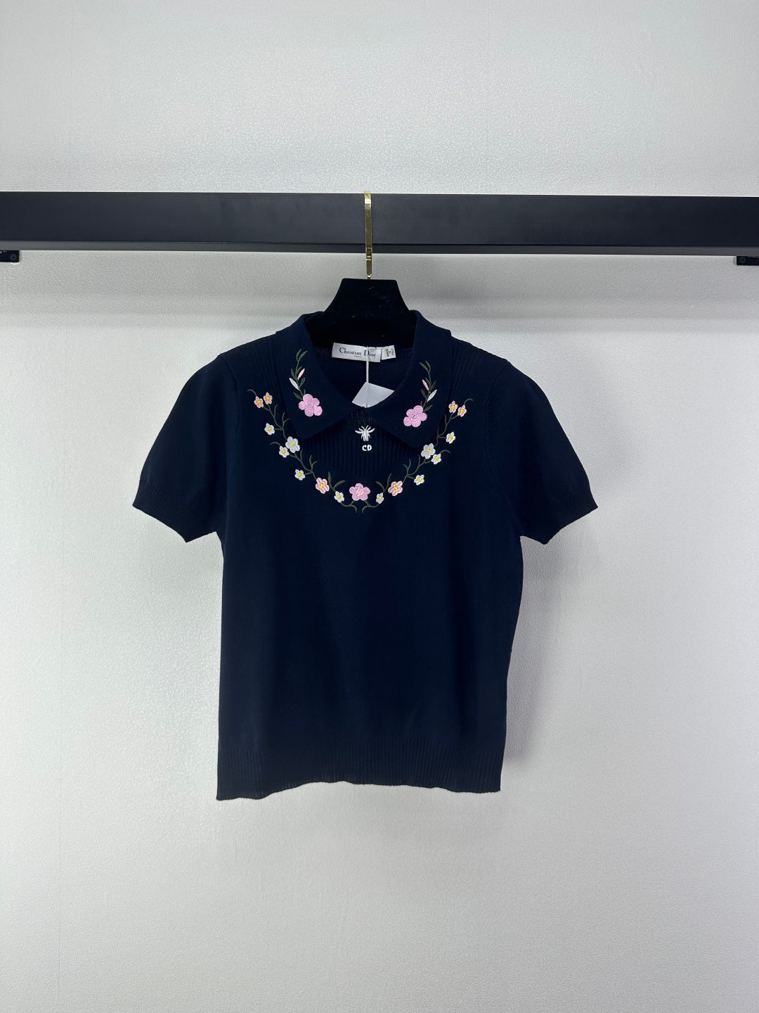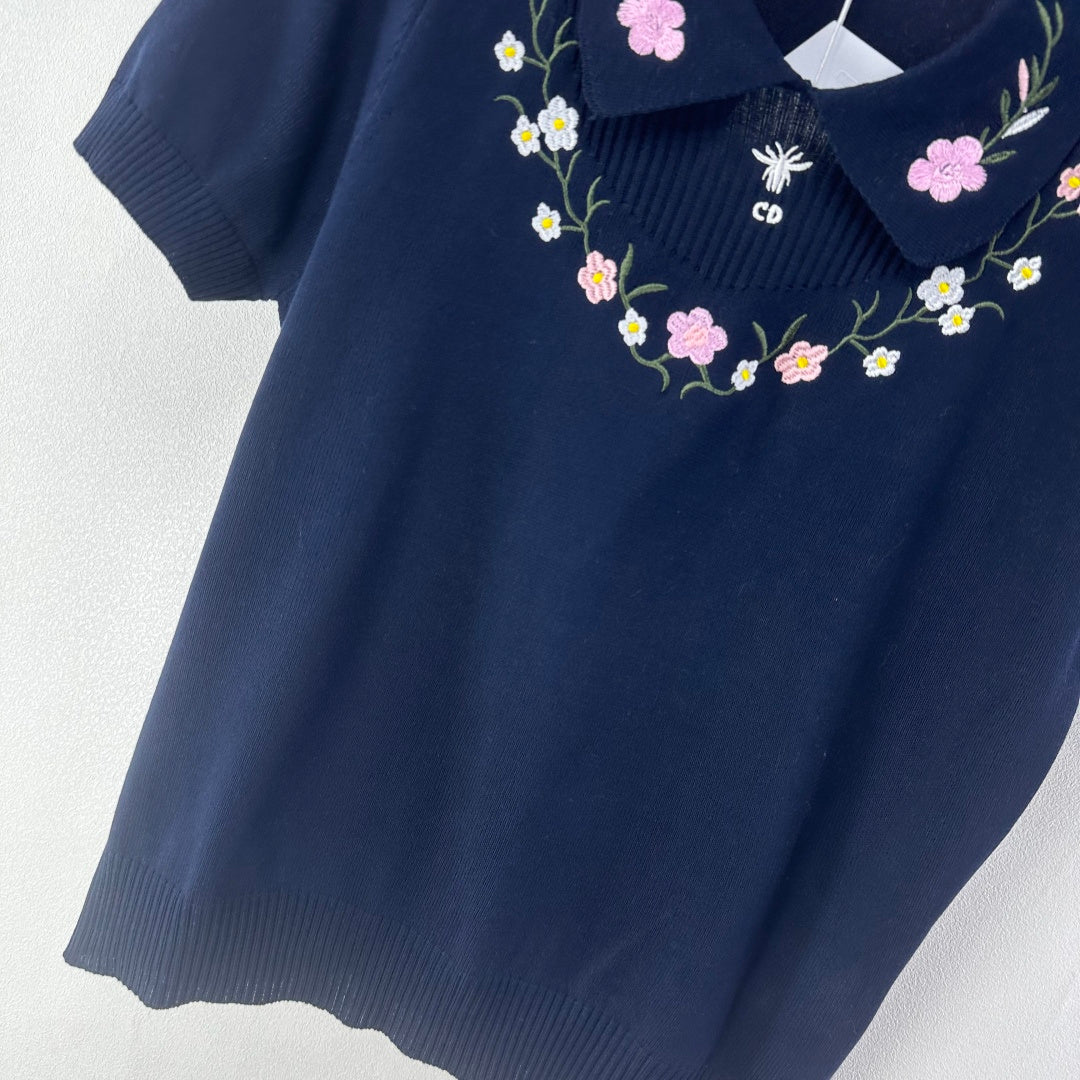 Dior Floral Embroidered Collared Knit Sweater Navy Blue in Viscose 360688