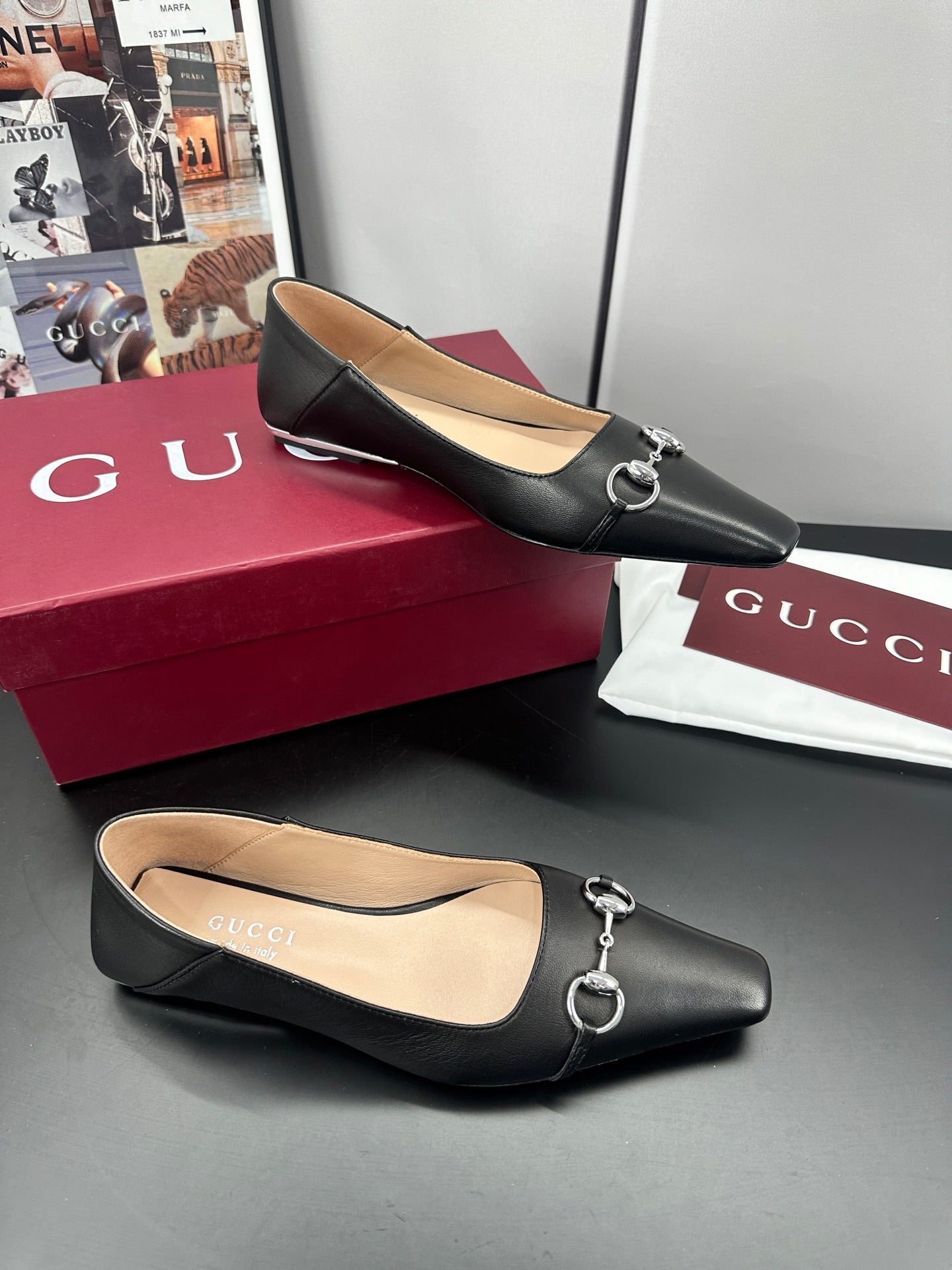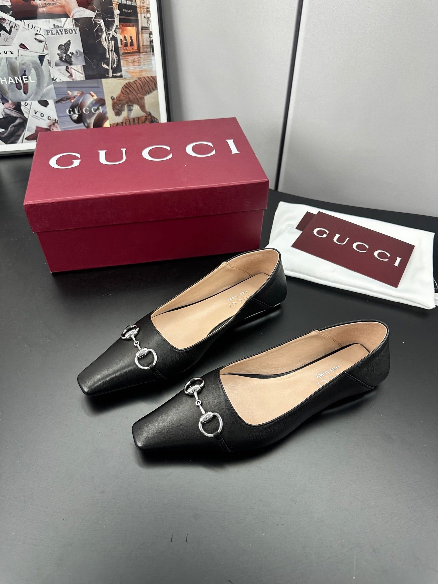 Gucci 26 Vittoria Horsebit Ballet Flats Black in Leather 688309