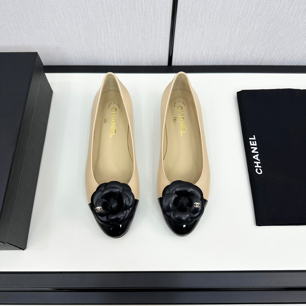 ballet flat flower beige calfskin black patent calfskin