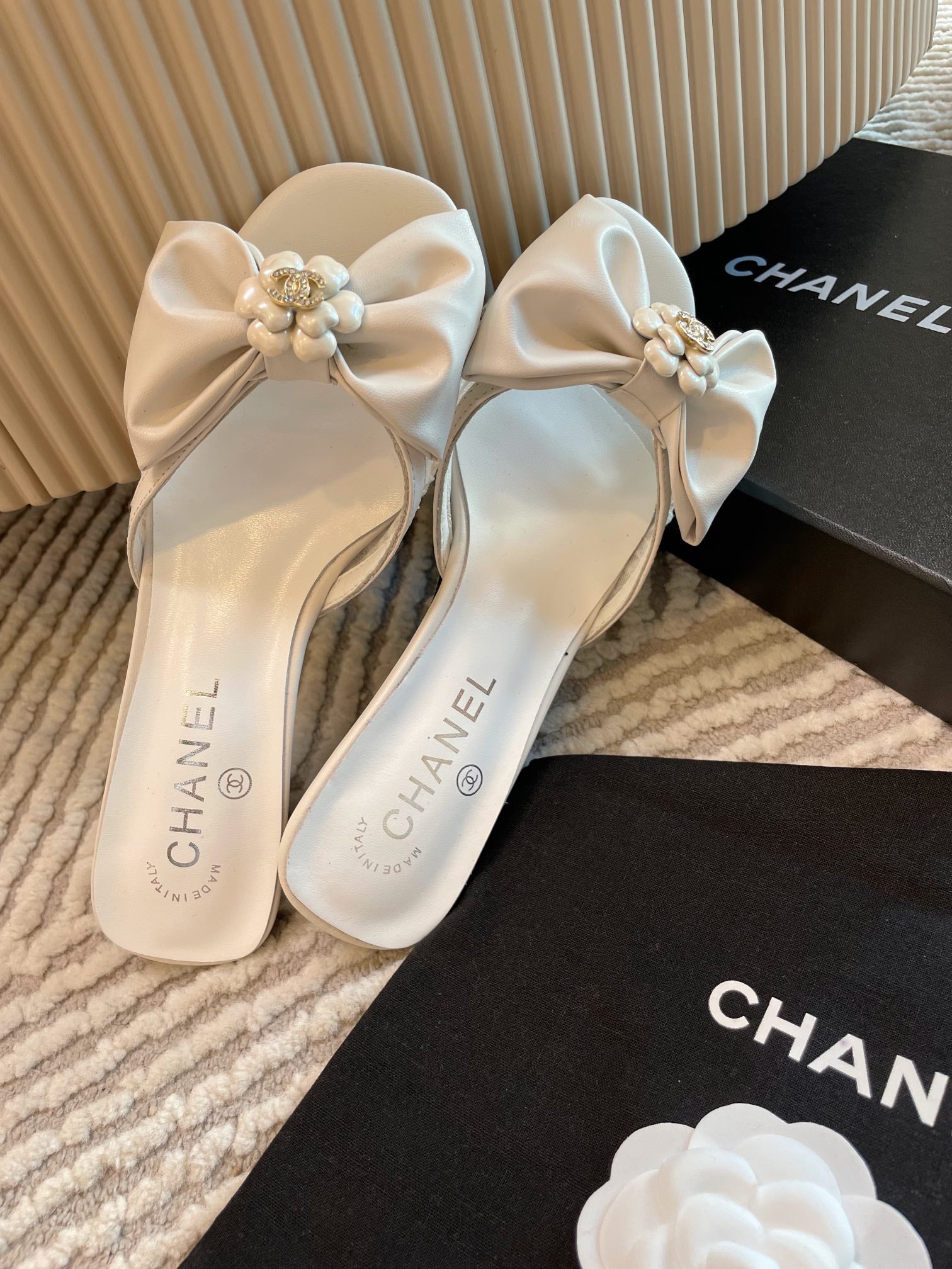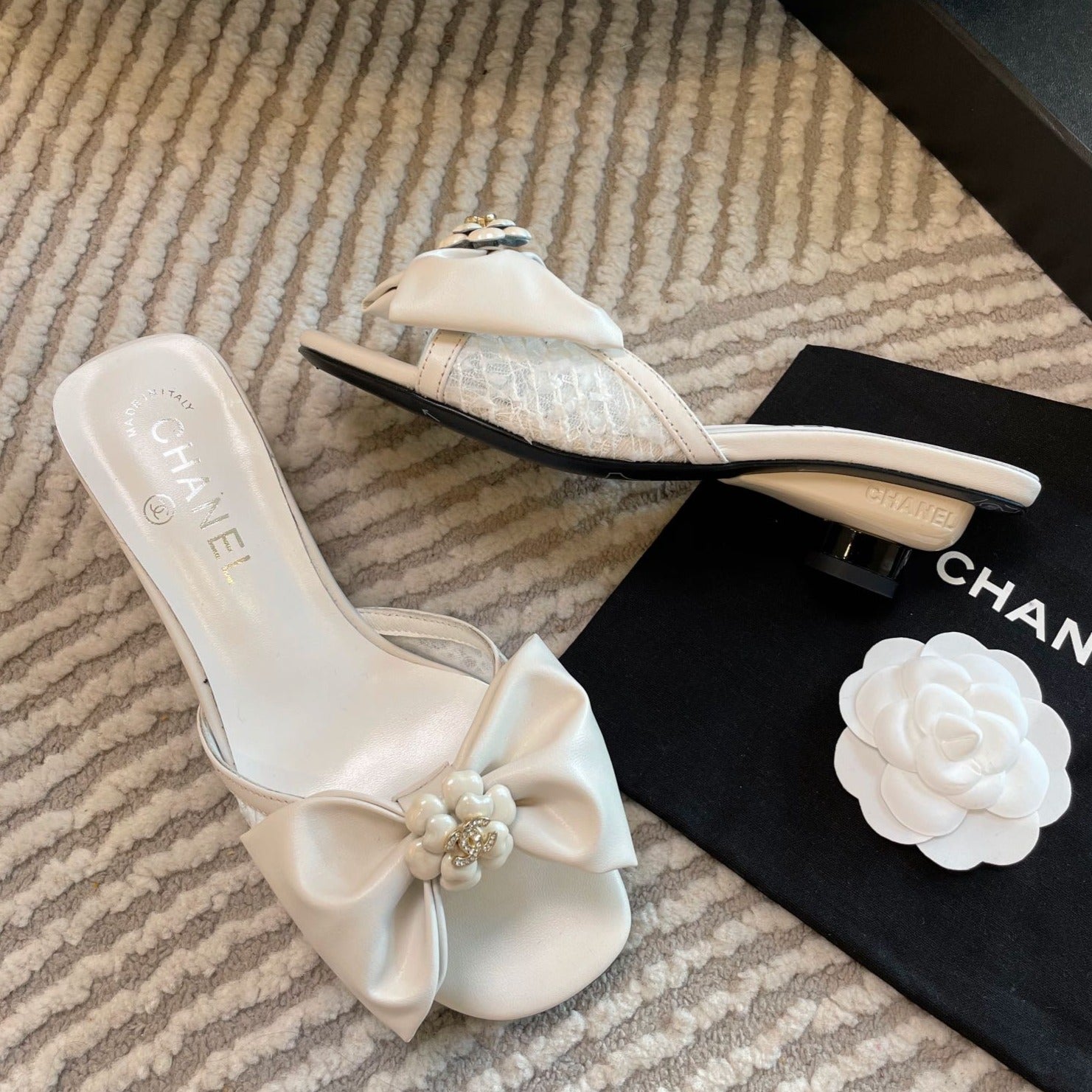 mule sandal bow flower white calfskin