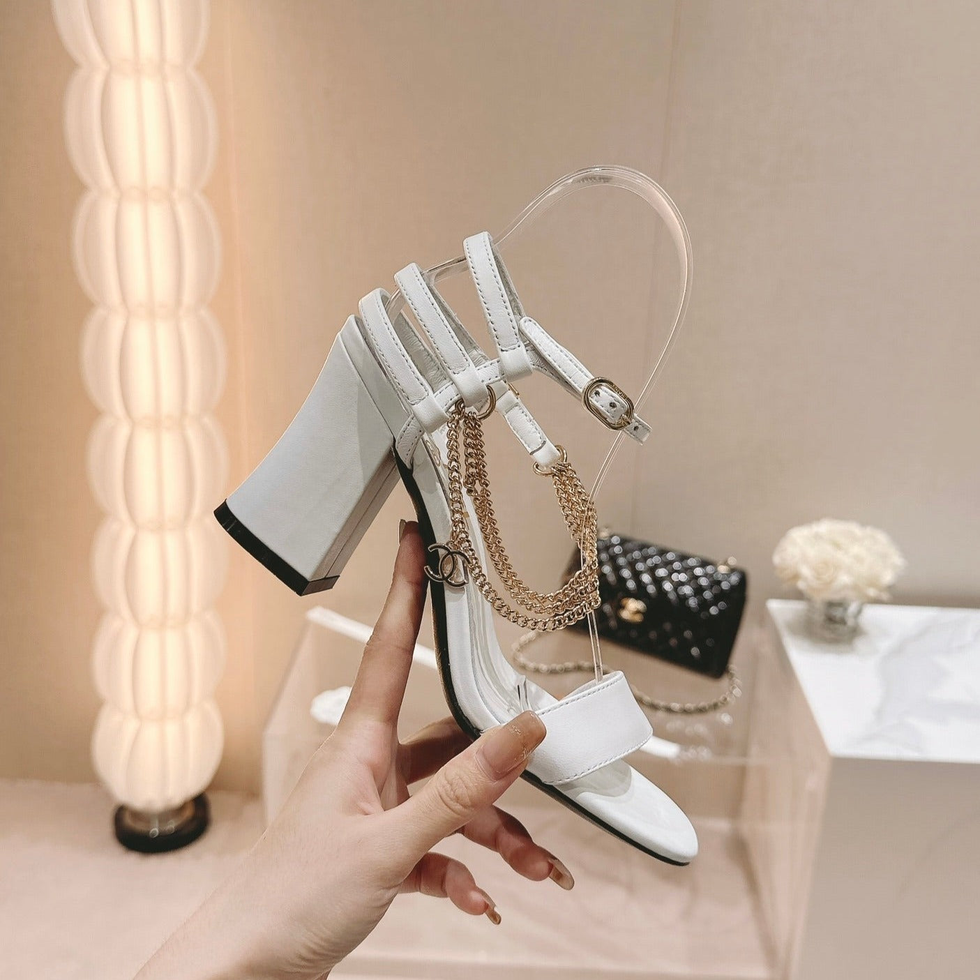 Double C Leather High Heel Sandals White