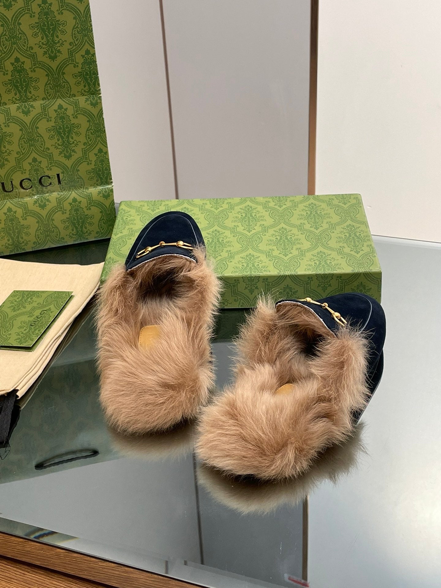 HORSEBIT MULE IN NAVY BLUE SUEDE AND LAMB WOOL LINING