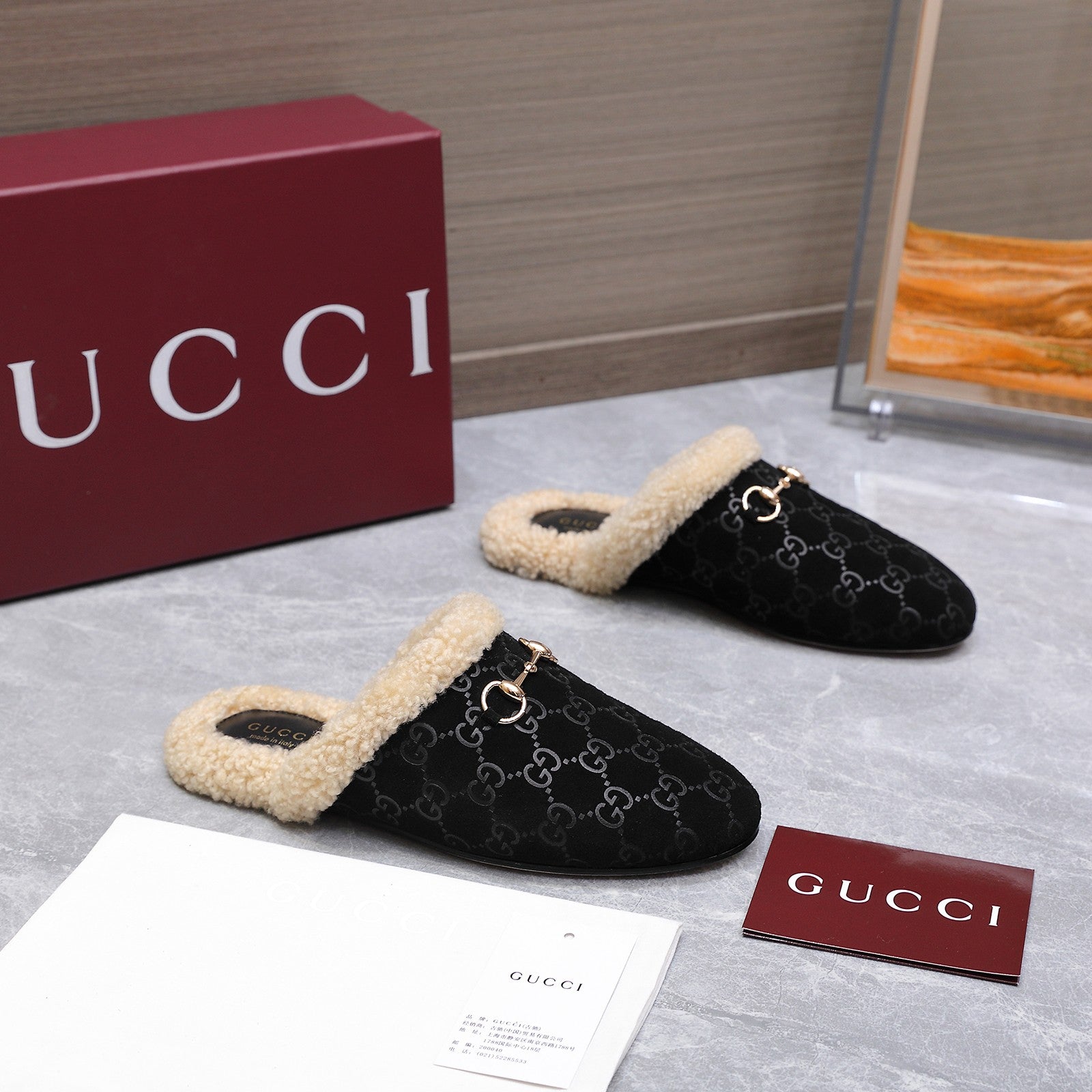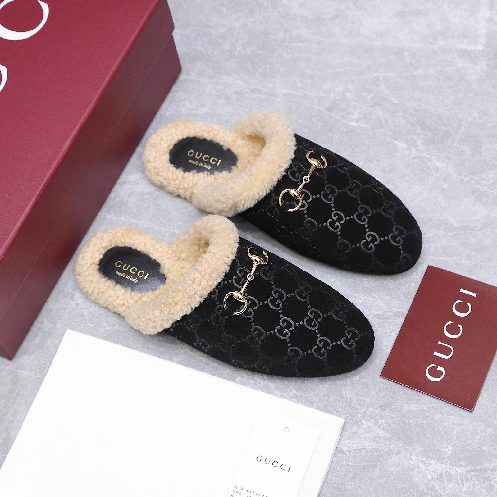 GG Horsebit Mules with Black Insole Suede Shearing 547331