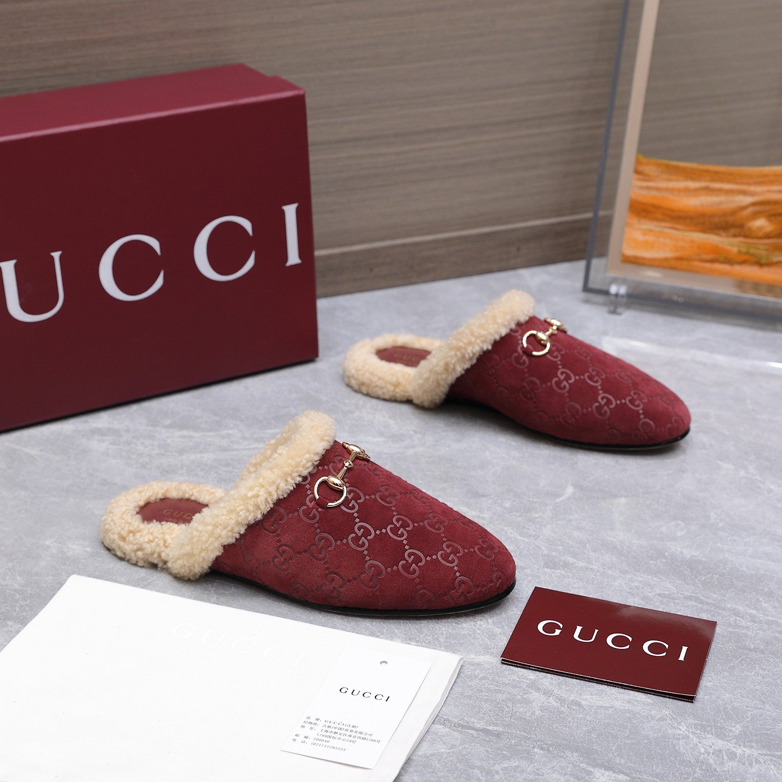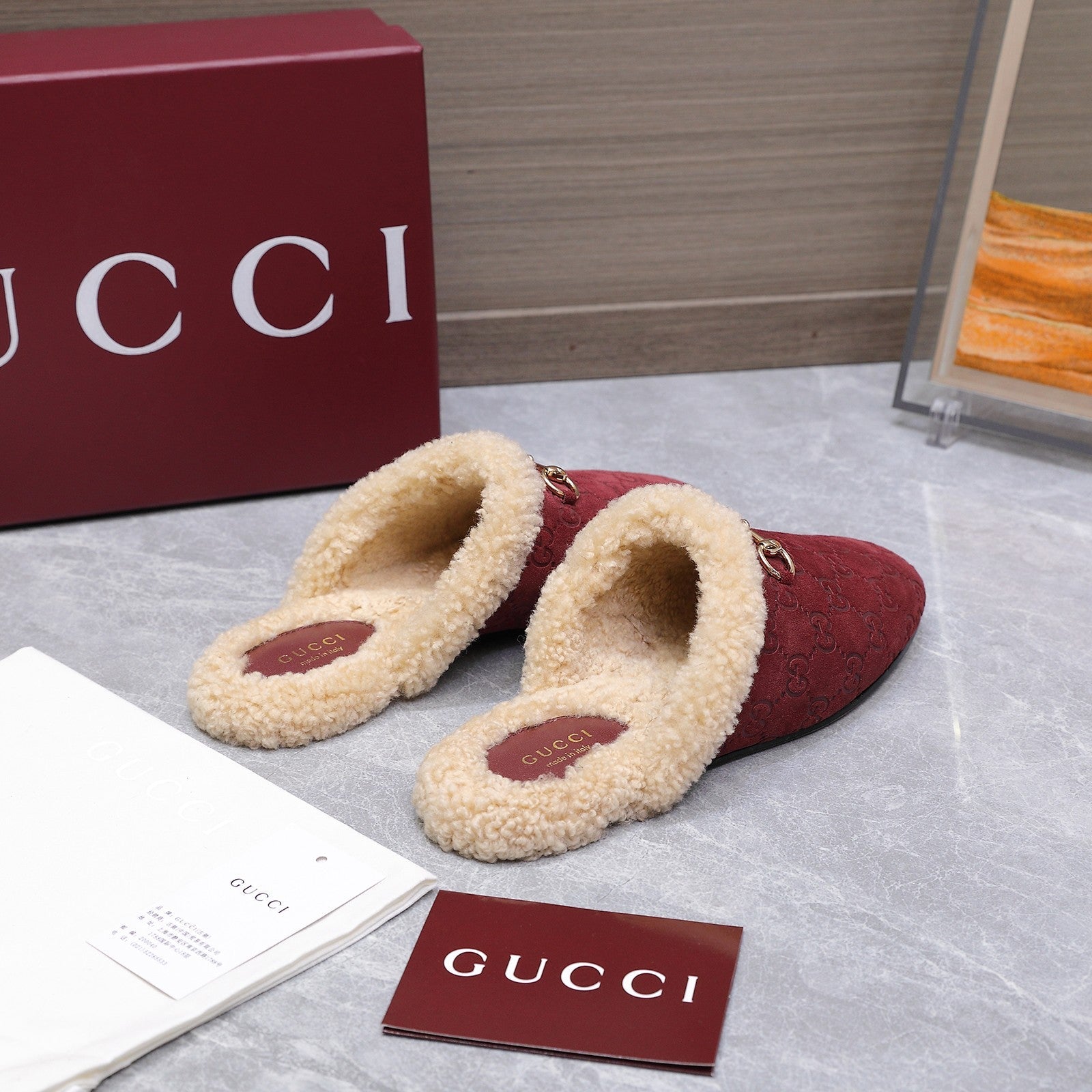 GG Horsebit Mules with Burgundy Insole Suede Shearing 547329