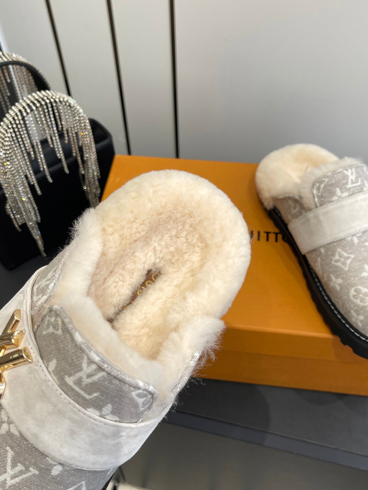 LV Cosy Flat Slippers Comfort Clog Light Khaki Beige Leather Monogram Fur 533470