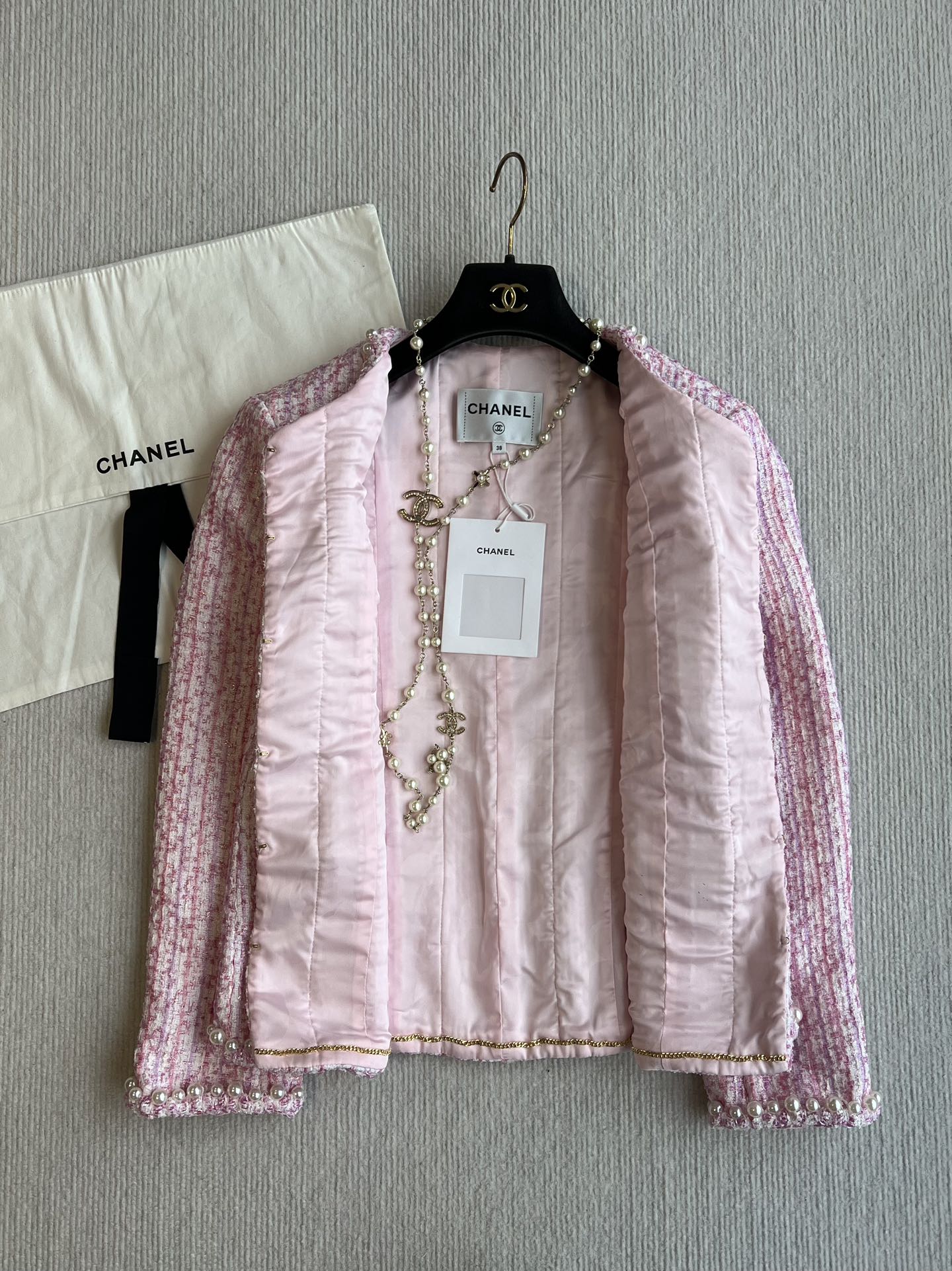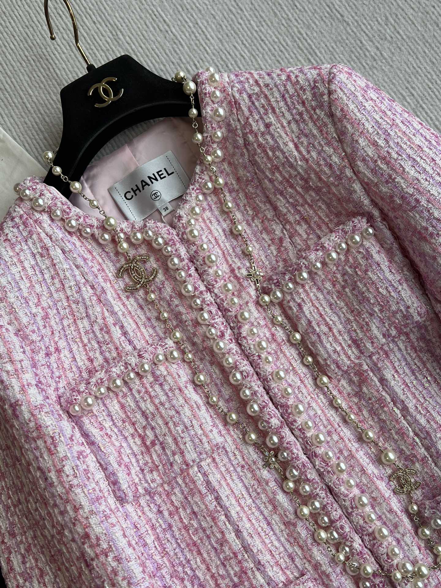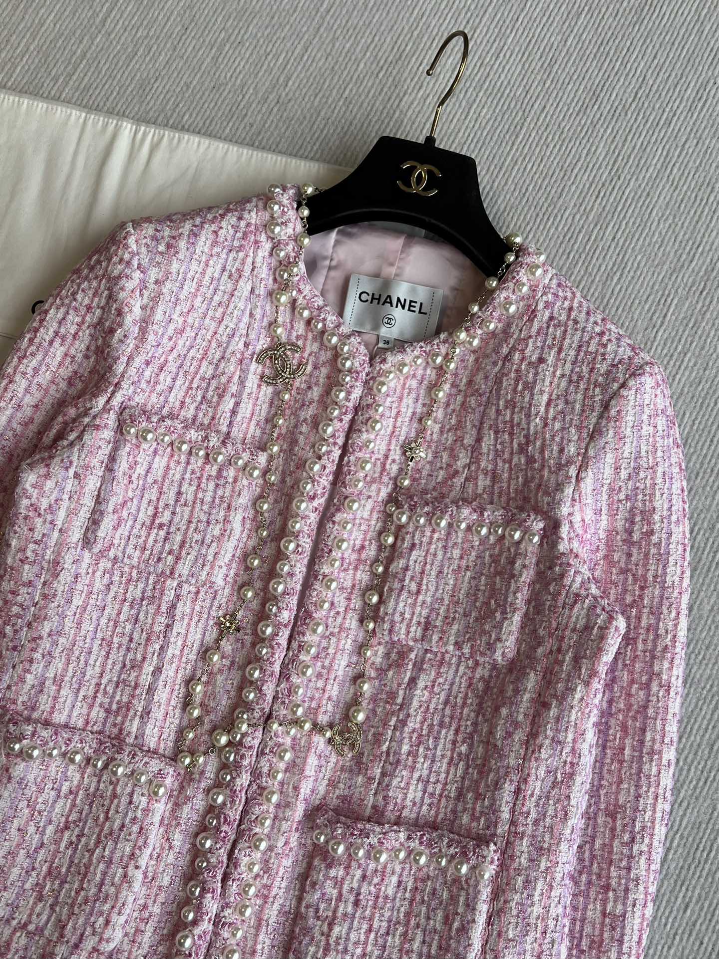 Chanel 25P Cardigan Pink Tweed With Pearl 235893