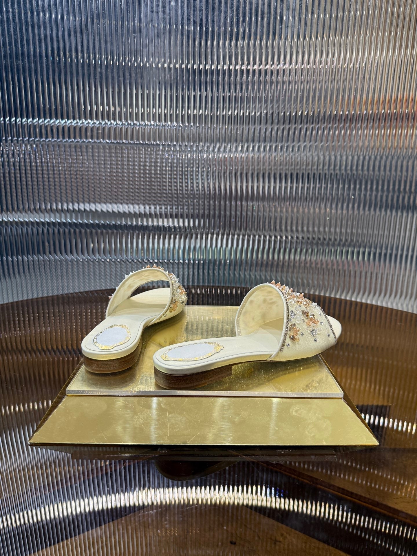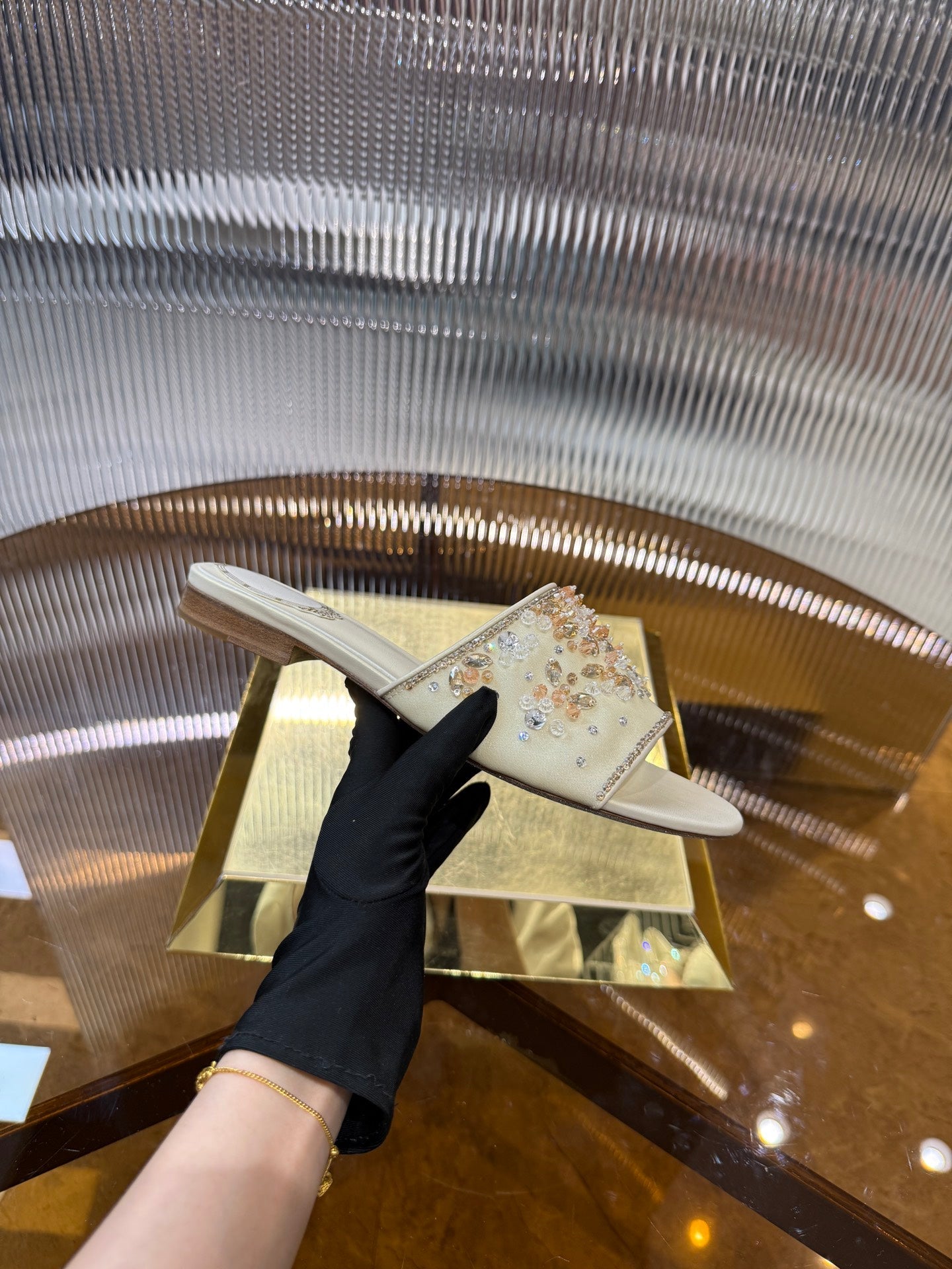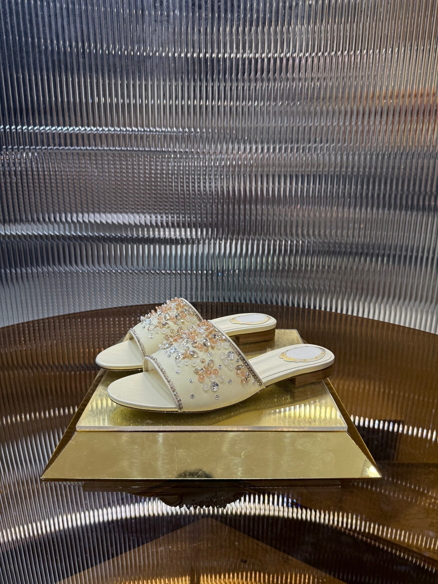 RC 25C Butterfly Flower Sandals Slippers Light Gold Sheepskin Rhinestone 275766